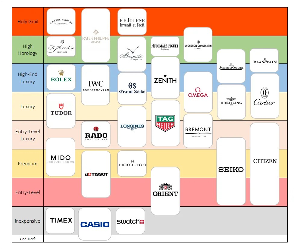 Линейка шире, но стартовые цены разные и часы со схожими механизмами будут немного отличаться по цене, а возможно и по таким качествам как герметичность, толщина корпуса, качество материалов, сложность циферблата. Я скинул эти таблички лишь по тому, что Krymskij скинули табличку выше, которая также основана на стартовых ценах, но только более грубо. Да все эти таблички "престижности" в основном основаны на стартовых ценах и по ним многие люди также делают выводы о престижности. Я не считаю, что это основной признак престижности, поэтому указал и другие. Например начальные кварцевые часы Frederique Constant продаются сейчас за 90 000 р. Ничего в них особенного нет и стоит там примитивная дешевая Ronda 515 без функции EOL, но якобы с доработкой от FK. Что там дорабатывать? ЛОЛ. Лохотрон чистой воды. В большей части их механики также стоят самые простые "базарные" 38-часовые ETA . Но бренд почему принято считать "престижным", просто потому что они цену загнули и сзади часы немного украсили (это я так понимаю и есть "особое исполнение и эксклюзивность"). Никаких бриллиантов и платины там нет, как и каких-то особенных металлов. Но типо престижные. Так еще про многие "престижные" бренды могу сказать. А вот Hamilton и Mido это объективно хорошие часы по многим показателям и стоят адекватно. Ничем они особо не уступают многим ближайшим по цене начальным "престижным" брендам, а по некоторым показателям наоборот лучше. Есть действительно объективно люксовые бренды, где используются драгоценности, дорогие металлы, действительно уникальное исполнение, малая толщина и диаметр при высокой герметичности, по особенному доработан механизм и т д., это да. Но половина "престижных" брендов это просто переоцененный лохотрон с завышенными ценами, примитивными механизмами и мнимой эксклюзивностью. Не все модели конечно, но большая часть часов "престижных" брендов ничего особенного из себя не представляют, что бы они стоили дороже тех же Hamilton или Mido.