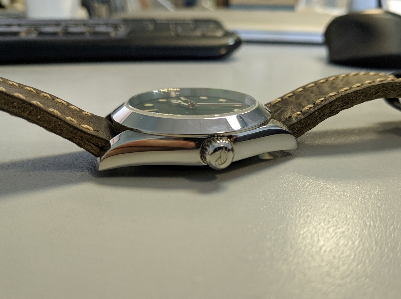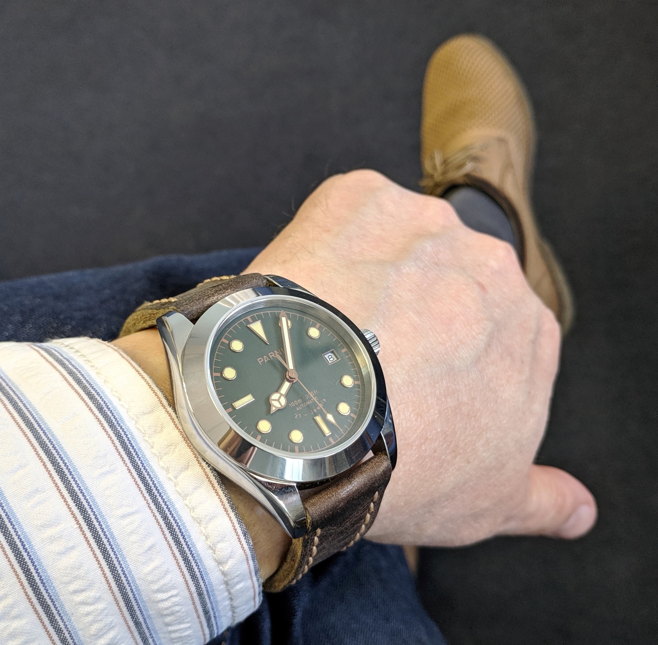В итоге случайно наткнулся на вот эти Парнисы. Уж очень понравилось сочетание матового темно-зеленого циферблата, желтых меток и коричневых надписей!