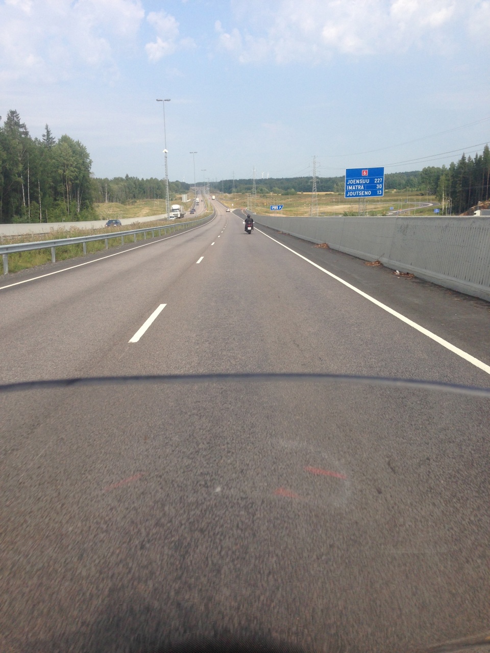 Вот дождь и закончился, выдвигаемся дальше Финский погранпост и опять очередь!!! Тут мне начал махать финский пограничник, мол проезжай по обочине к светофору. Сказано - сделано, я у же первый в очереди. Подьехал к окошку, отдал докУмент, начал снимать шлем, но пограничник остановил меня, сказав, что вроде и так похож. Я поблагодарил его и выехал за шлагбаум, все официально я на территории европейского государства