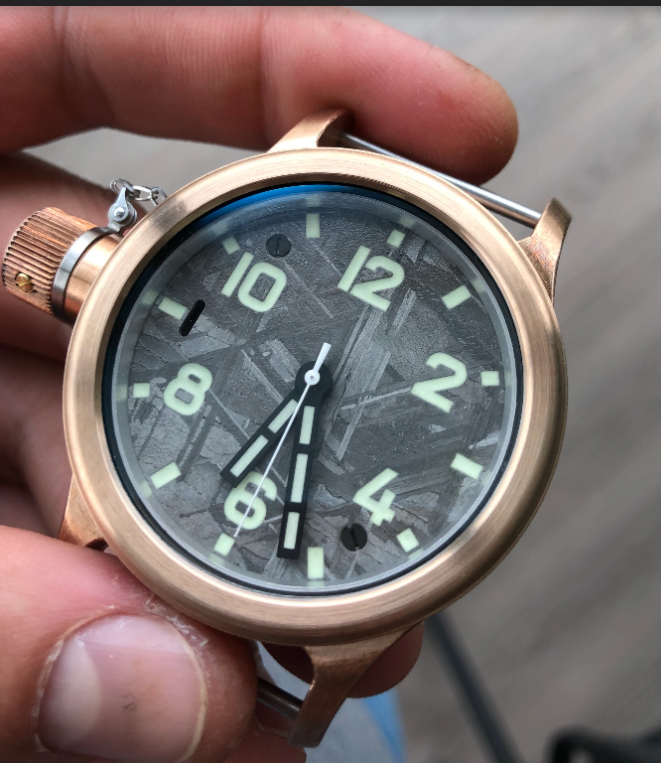 Да, вы можете получить циферблат с метеором. Циферблат из метеорита и стальной корпус с дробеструйной обработкой. Или бронзовый корпус с атласной отделкой.