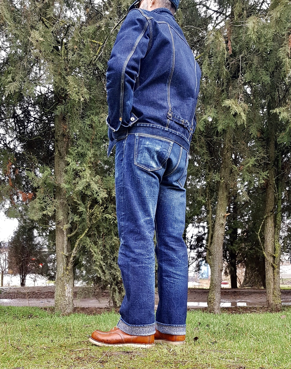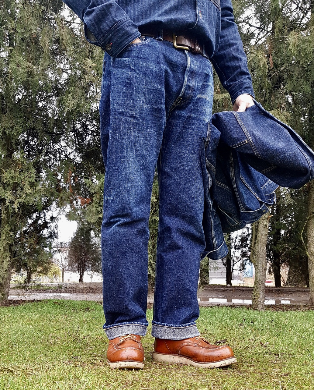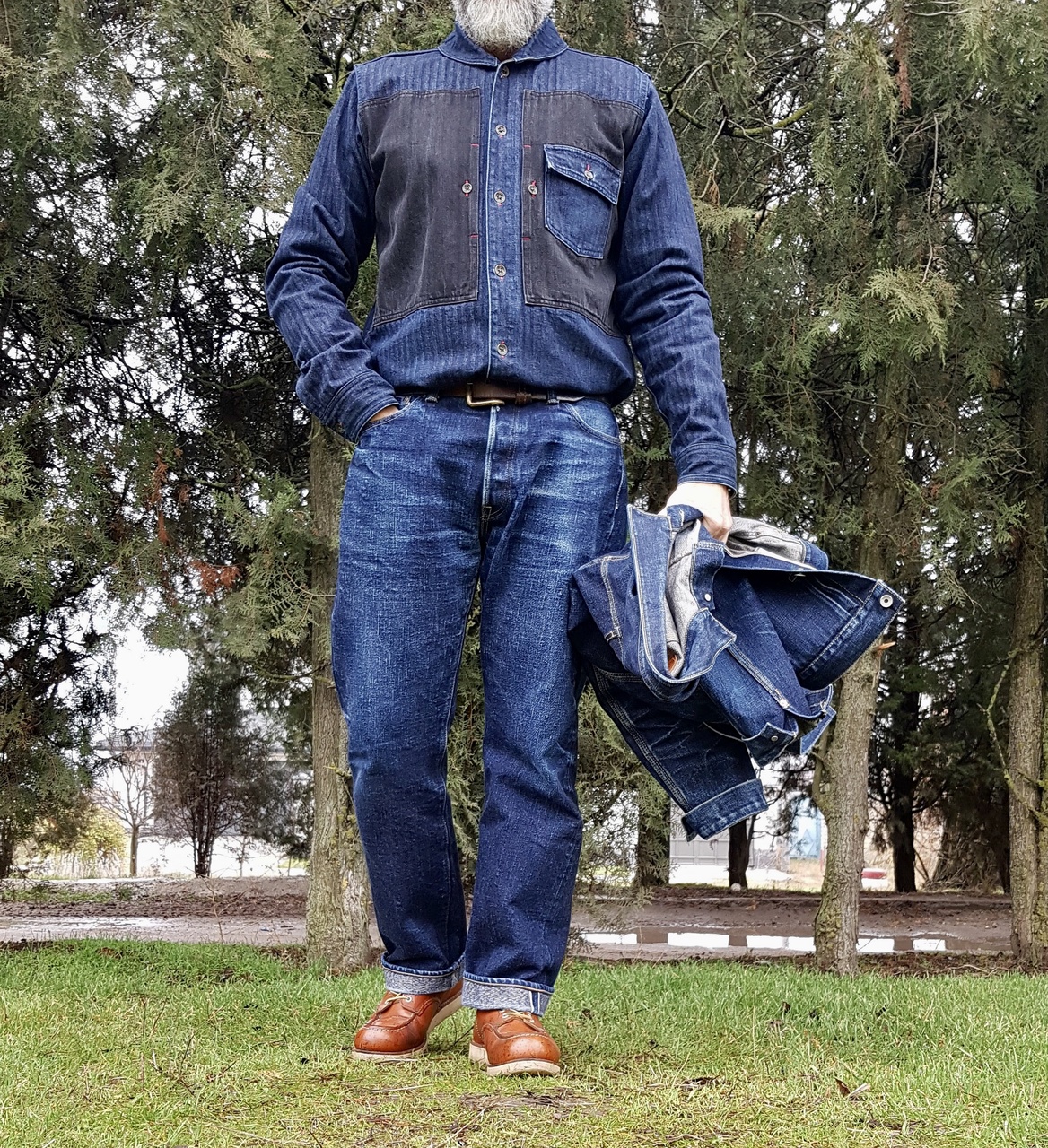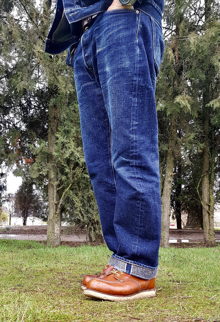 Поделюсь немного впечатлением о моих самых тяжёлых джинсах от китайских товарищей. Вес указан до 20,5 oz. Купил их в распродажу 11.11. Вторую неделю ношу. Уже один раз крутанул их в стиралке в 40° и 400 об отжим. В Поясе уж больно широки были. Вторые мои штаны от sauce zhan. Первые 18oz в немнго более широком фите (316), ношу год. 3-4 стирки. Точно не помню. На фото новые ещё не стиранные. Реально выглядят и те и другие на много темнее. Синий уток до стирки имел небольшой стальной отлив. А снаружи очень тёмные и матовые нитки. Кстати, химического запаха, как от прошлогодних, не было. Руки и всё вокруг себя, джинсы красят довольно сильно. Даже после стирки, руки синие постоянно. Фит не совсем мой. Через икры с трудом стягиваю штаны, и внизу отверстия на 1,5 см меньше, чем в 316ом фите. Вроде как тяжёлые джинсы для зимы, и соответственно ботинок. Хотелось бы чуть побольше отверстие внизу. Предыдущие довольно долго "обкатывались" по фигуре. Теперь сидят идеально удобно. Эти, надеюсь, со временем тоже сядут как надо. Сам деним, довольно фактурный. Швы местами достаточно небрежно сделаны. Не то что бы кривые. Этого нет. Но как то нарочито кустарно. Кстати заклёпки на этой модели классные. Прям как будто зубилом буквы набиты. И металл достаточно толстый. Деним довольно плотный, но уже немного начинает "распушаться". Кстати в -30 в них ходить минут 10-15. Без подштаников вполне себе комфортно. Себя фотографировать в зеркало, то ещё занятие. Поэтому на себе фото не будет. Извините. Надеюсь, что этими штанами закрывал для себя тему тяжёлого денима. Есть много всего уже. Носить не переносить. За год двое соусов и двое red tornado приобрёл. На уме ещё IH 25 oz. Но это только если подружусь с этими 20тиозными. Всё же джинсы для меня, это в первую очередь, удобство и практичность. А эстетика и джинсовые легенды уже вторичны.