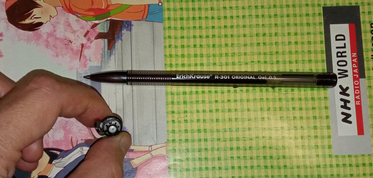 Смысл: попробовать и вспомнить как гель себя ведёт на лащёных страницах, обычной принтерной бумаге, кассовых чеках и т.д., ну и плюс возможность сделать из него (потом) ручку-малышку при необходимости - длину ручки с колпачком с 14.5см можно спокойно уменьшить до 12.5см, а может и 12см с новым стержнем, который правда потом придётся постоянно подрезать (новый).
