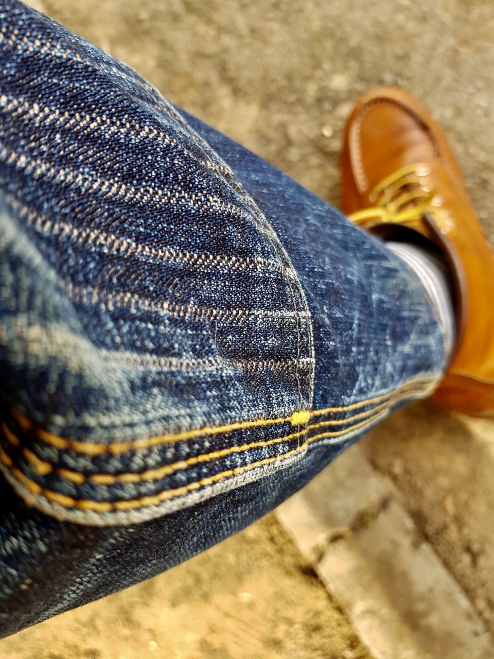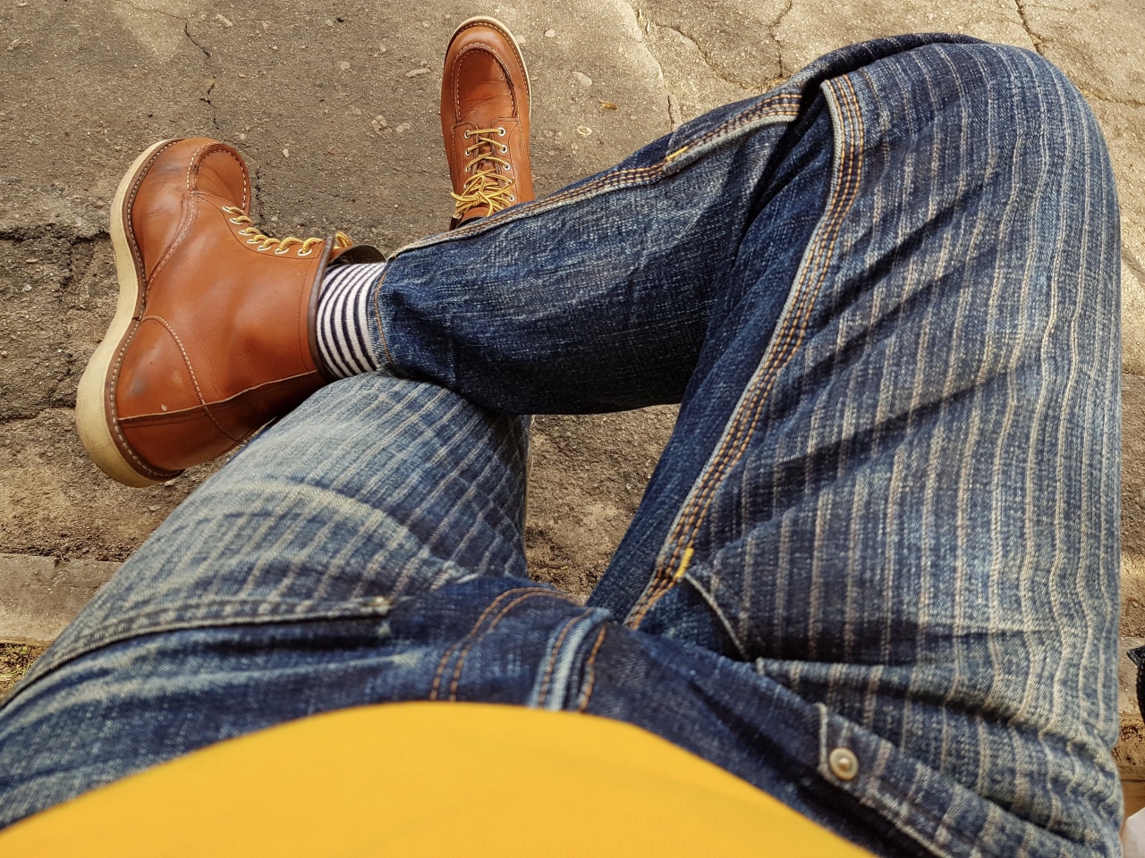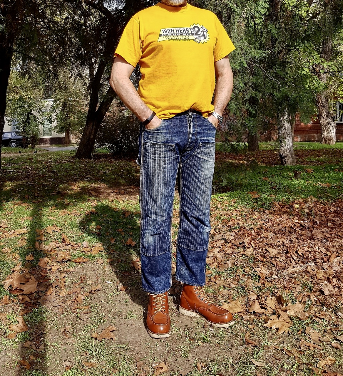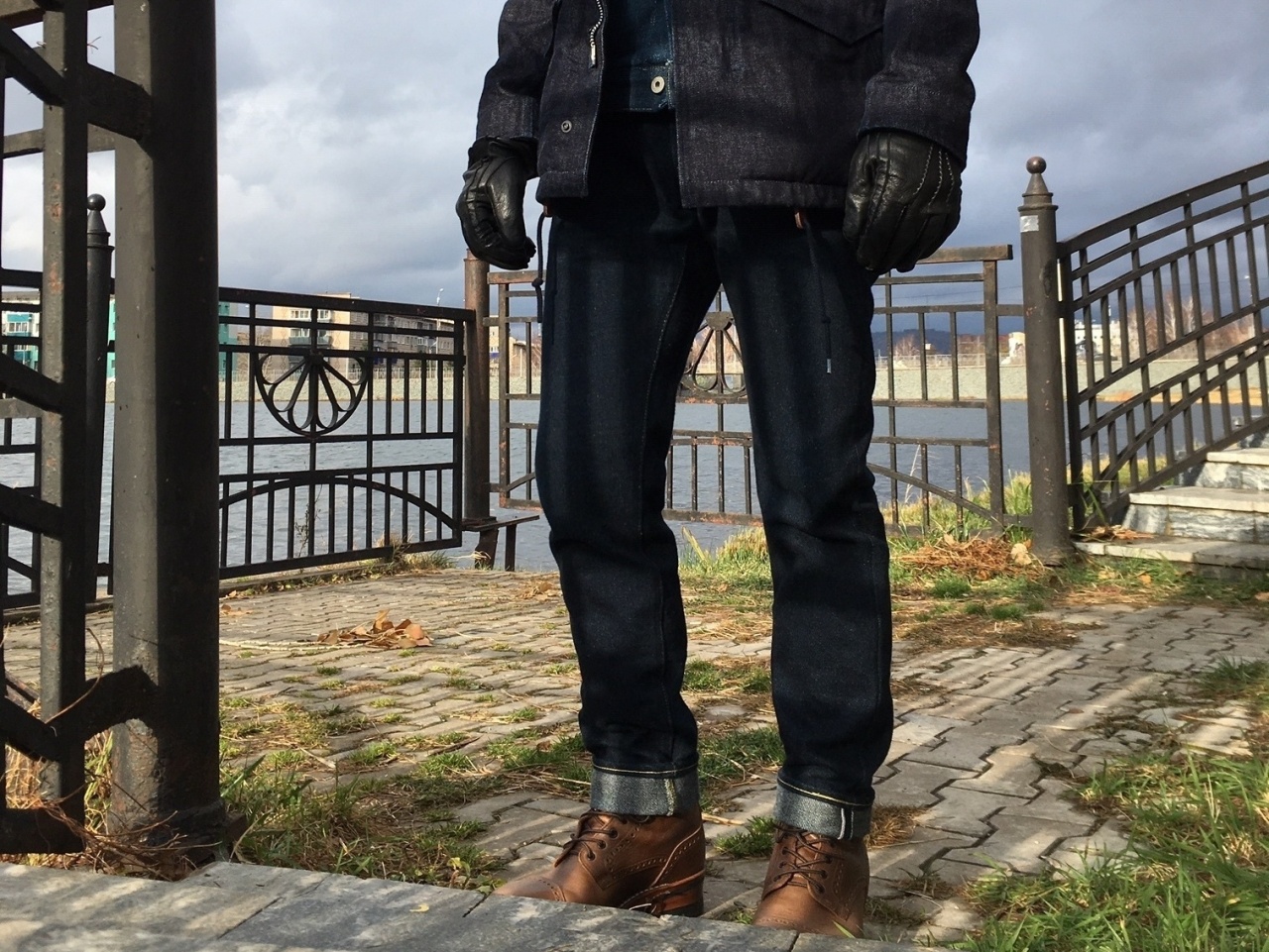 Сборка изобилует интересными деталями , особенно замечательно смотрится микс 15 унцового Отокоги и полосатого фактурного 17 унцового ( плетение herringbone) ... на выходе имеем богический фэйд ... потрясающе красивый штан