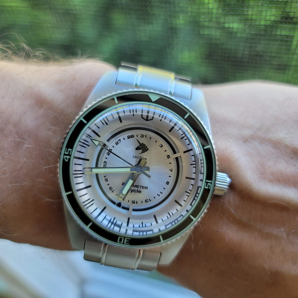 Вот реальное фото таких часов с белым цифером. Цифер на самом деле не белый, как эмаль, а имеет очень приятный цвет и текстуру матового алюминия. Все надписи, деления и все остальное выполнено очень достойно, все ровно нанесено и приклеено. Стрелки по середине имеют такой себе продольный излом, не знаю как назвать. За счет этого хорошо отражается свет и стрелки легко читаемы на светлом фоне циферблата. Окошко с числом имеет маленькую линзу. Оно объективно не большое, меньше, чем на Ориент 3 звезды и число считывается от туда несколько хуже. Не знаю, как будет у людей с нарушением зрения, но если на таких часах, как Ориент 3 звезды, число читается с затруднением, то тут будет хуже. День недели и месяц читаются без проблем, даром, что надписи маленькие. К размещению дней недели очень быстро привыкаешь и, видя куда показывает стрелка, сразу понятно какой день. Все усложнения, кроме месяца, работают и число/день недели меняется автоматически. Месяц приходится переключать вручную. Для меня - это не проблема, так как в любом случае раз в месяц приходится обращаться к часам, чтобы подвести время и/или число.