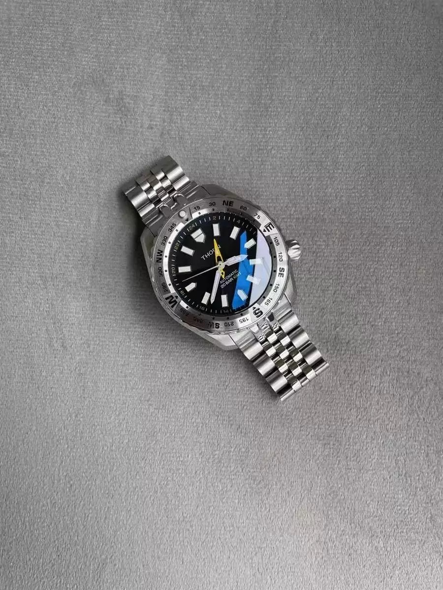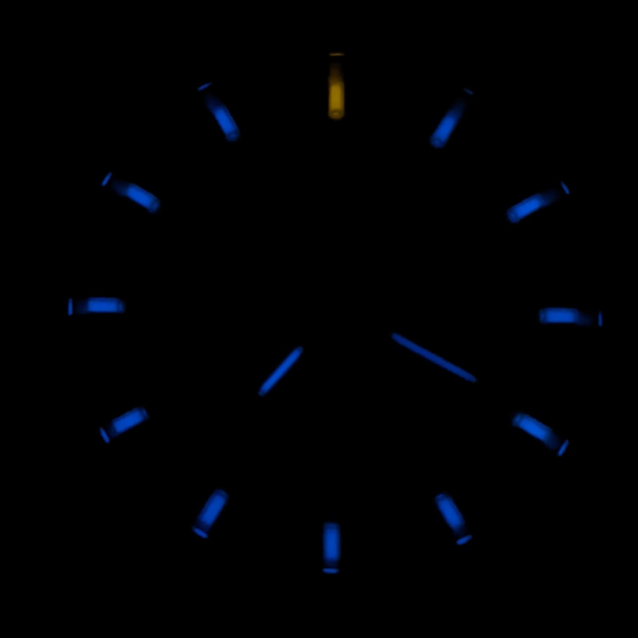 По яркости подсветки: когда внешнего освещения достаточно, чтобы увидеть стрелки, то подсветку не видно, но как только освещение падает ниже приемлемого уровня - часы загораются. Дома ночью при выключенном свете подсветка освещает стену с расстояния сантиметров десяти. Метка на 12 часов сделана в другом цвете и его становится видно чуть раньше, чем синие метки, но когда подсветка действительно нужна, то все метки светят равномерно. Если брать эти часы с зелеными колбами, то визуально подсветку тоже будет видно раньше, при более ярком свете. Но мне вариант с белым цифером и синей подсветкой визуально нравится больше. Я до этого проносил 10 лет часы с тёмно-синим цифером, а синяя подсветка выглядит достаточно необычно.
