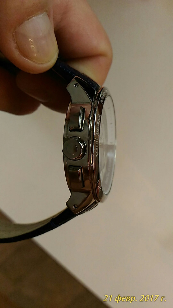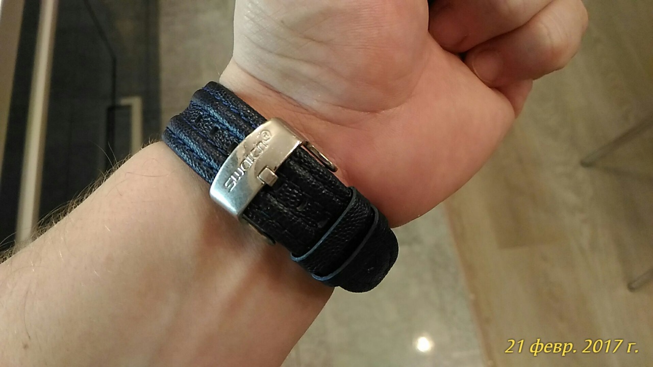 Ремешок хороший - внутри кожаный, снаружи покрыт какой-то непромокаемой хренью. Но больше всего понравилась бакля ремешка. Из-за того что она имеет не прямую, ровную форму как обычная бакля, а под углом градусов в 30, то конец бакли не давит на ремень в месте его перегиба и ремень не мнеться и не перегибается в районе бакли и служить будет гораздо дольше. Почему бы другим такие бакли не делать?