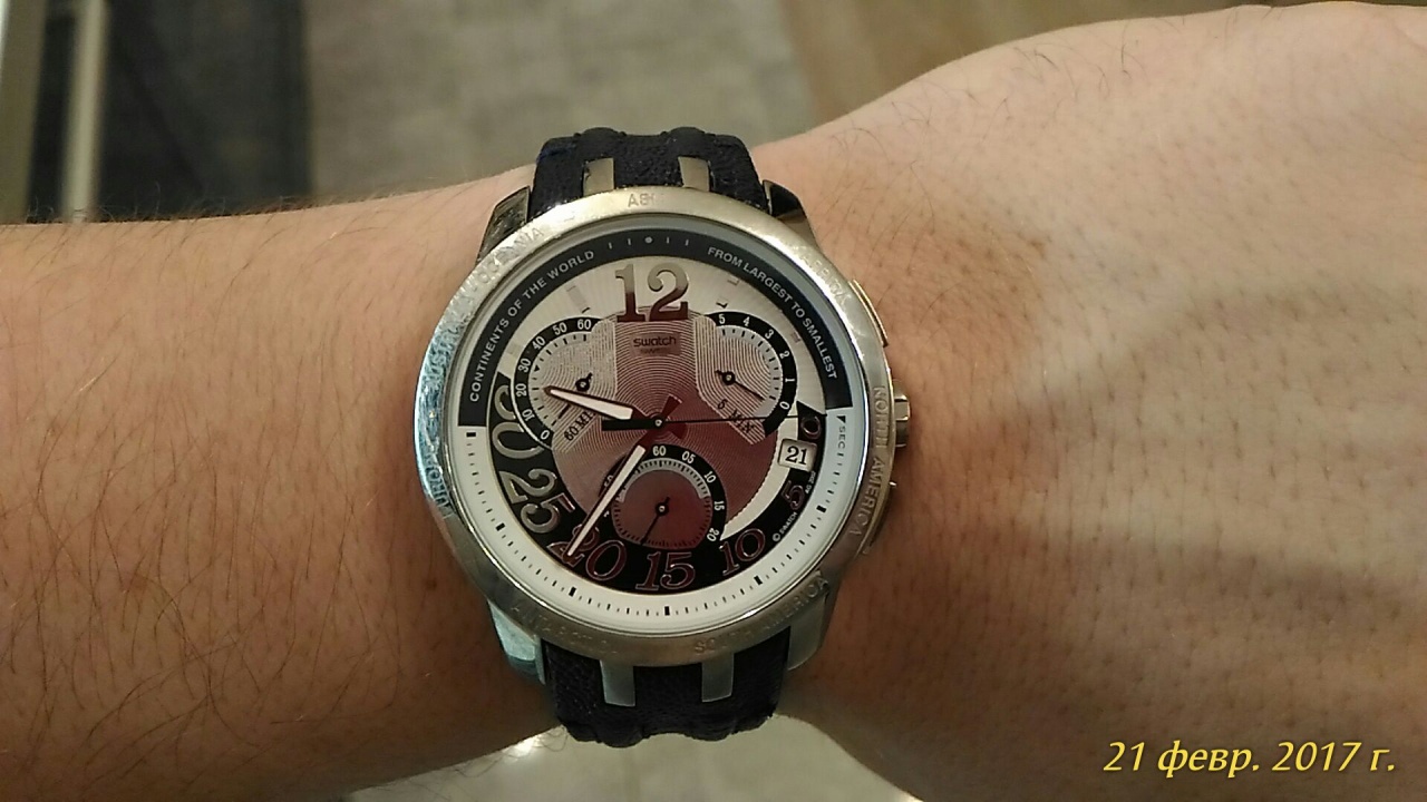 Механизм там кварцевый ЕТА на 4 камнях, водозащита стандартная для Свотч 3 атм., но зато стекло не пластиковое, а минеральное уже стоит, то есть не так быстро зацарапается. Дата имеется и по кругу на безеле название стран света, типа время континентов, но как это может функционировать, я даже не разбирался, мне не интересно, а жена и хронографом то пользоваться не будет, для нее главное чтоб красиво смотрелось и к определенному стили одежды подходило и чтоб заводить и время выставлять не нужно было - надел и пошел.