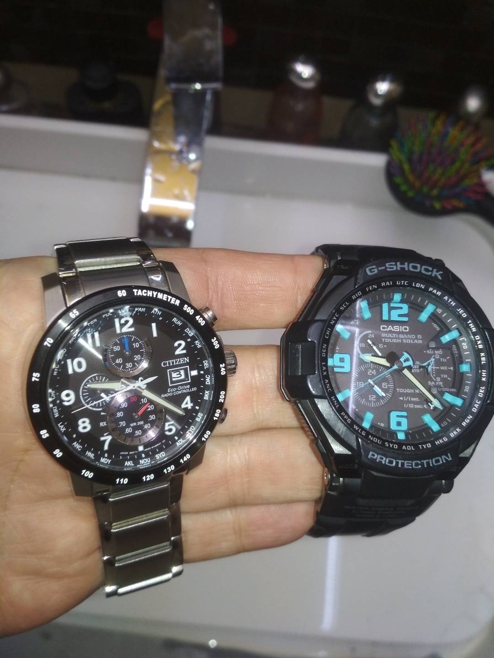 Калибр 8m25, он же "Dancing Hands" — "Танцующие стрелки". Давно хотел взглянуть на него одним глазком (как Кутузов, фьюить-ха), но тащить с eBay было лениво, да и мало ли: вдруг не понравятся? На той неделе повезло: случайно выловил такие часы на толкучке. Задняя крышка в заводской плёнке, на стекле небольшой скол, но, к сожалению, корпус из base metal, и покрытие местами начало вздуваться. Между ушками уже сталактиты растут...или сталагмиты, я их путаю...короче — типовая болезнь. Но просили недорого (скорее — неприлично дёшево), а в шкатулке лежать — какая разница? Ну и нечастое оформление — бонусом.