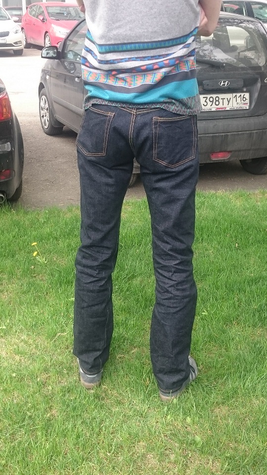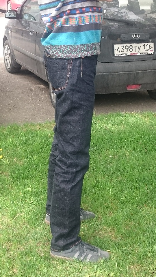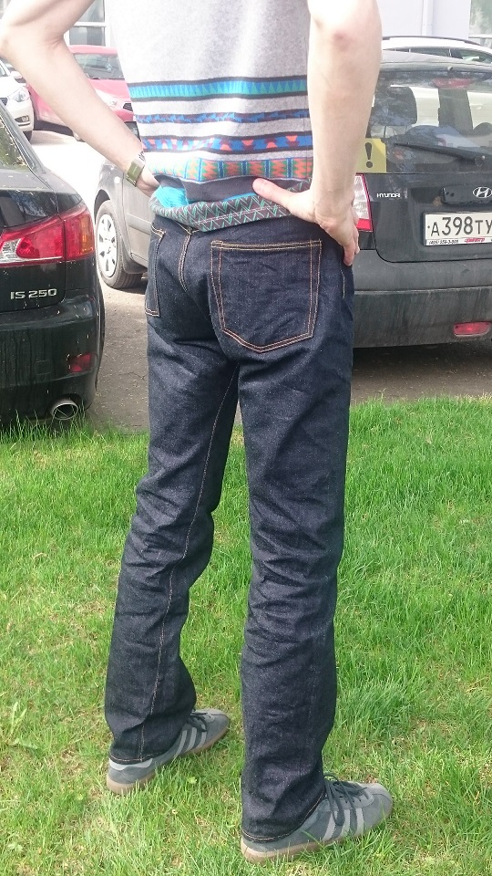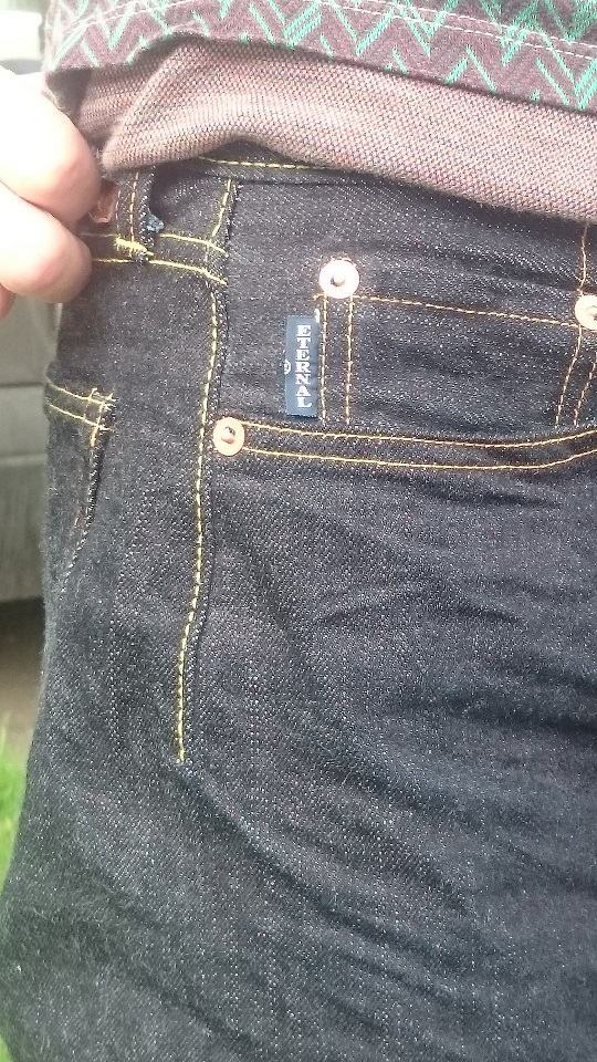 Итог: штанами доволен, фактура вертикально-полосатого денима с темным синим прокрасом впечатлила. Собраны очень хорошо, придраться не к чему. Скрытые клепки на задних карманах, Этерналовский таб на маленьком фронтальном кармане и вообще - все достойно. И теперь я знаю, что такое жесткая фабричная усадка) Разглаживать штаны не стал, понимая по отзывам, что дело это неблагодарное.