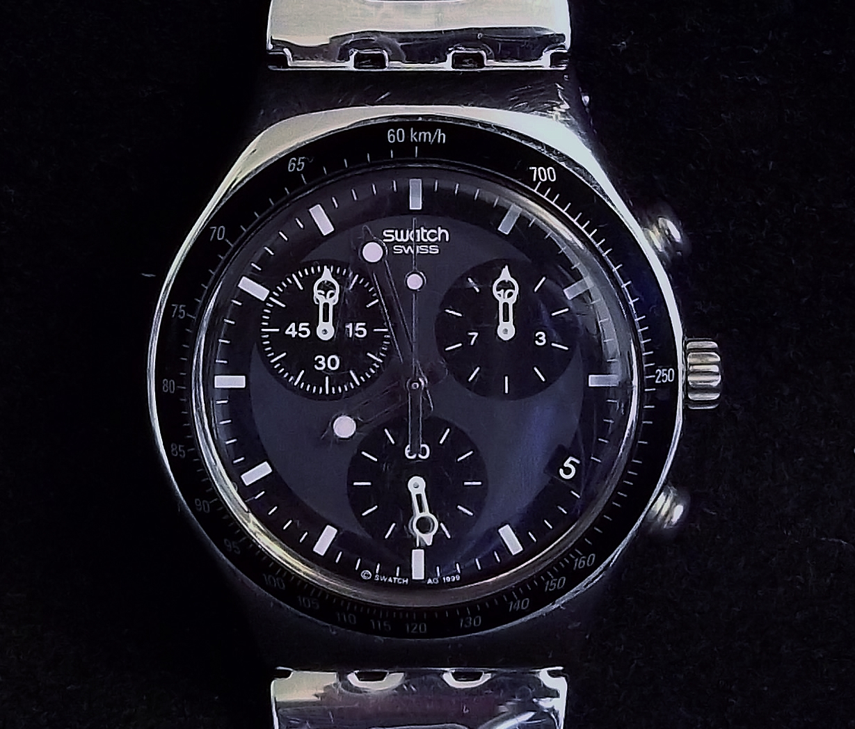Стоили правда для кварцевого Свотч дороговато: 12500 рублей. Столько же как и механический Свотч Систем 51 в стальном корпусе и на браслете. Но в принципе это же хронограф.