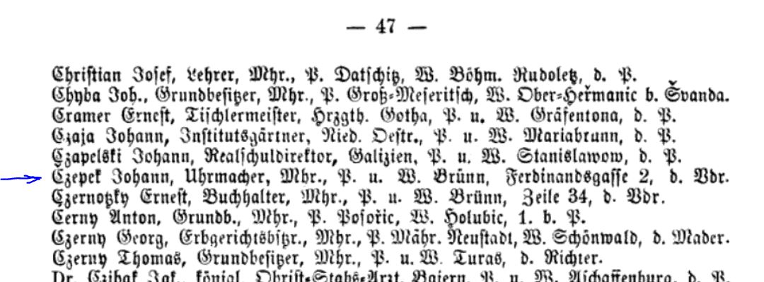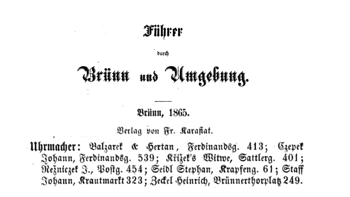 В книге "Führer durch Brünn und Umgebung Zum Gebrauche für Einheimische und Fremde" - "Путеводитель по Брно и окрестностям для местных жителей и иностранцев" 1865 года в разделе "Часовщики" указано, что его заведение находится на Ferdinandsgasse, 539. В 1872 году он являлся членом моравской ассоциации разводчиков медоносных пчел (?), общества виноделия и садоводства и прочая, прочая.