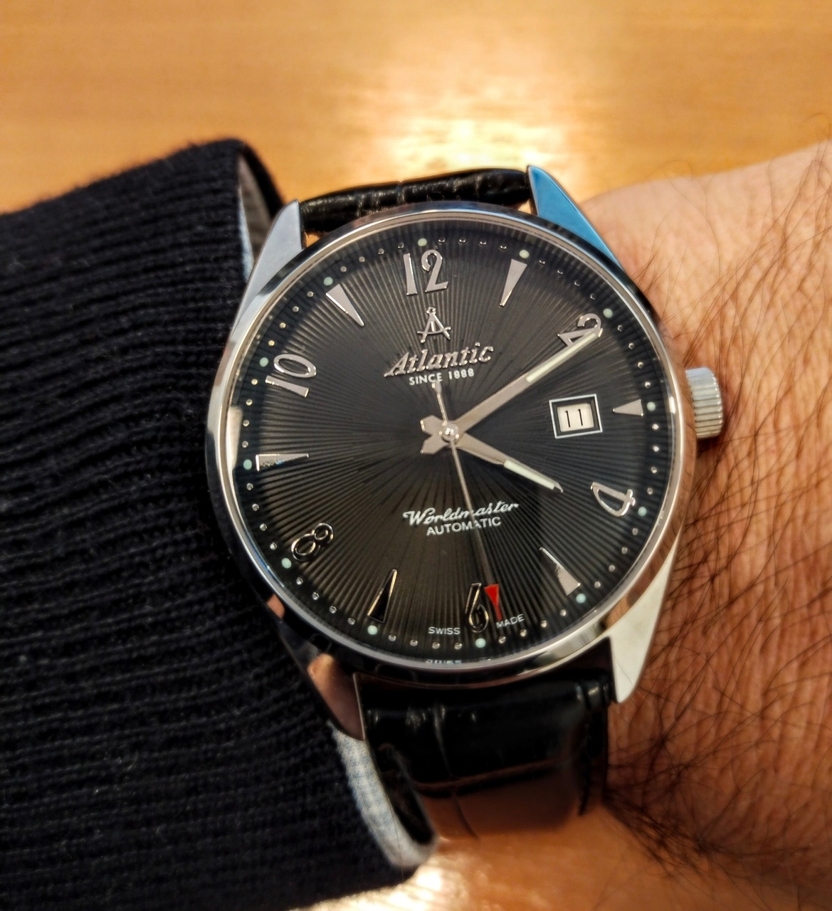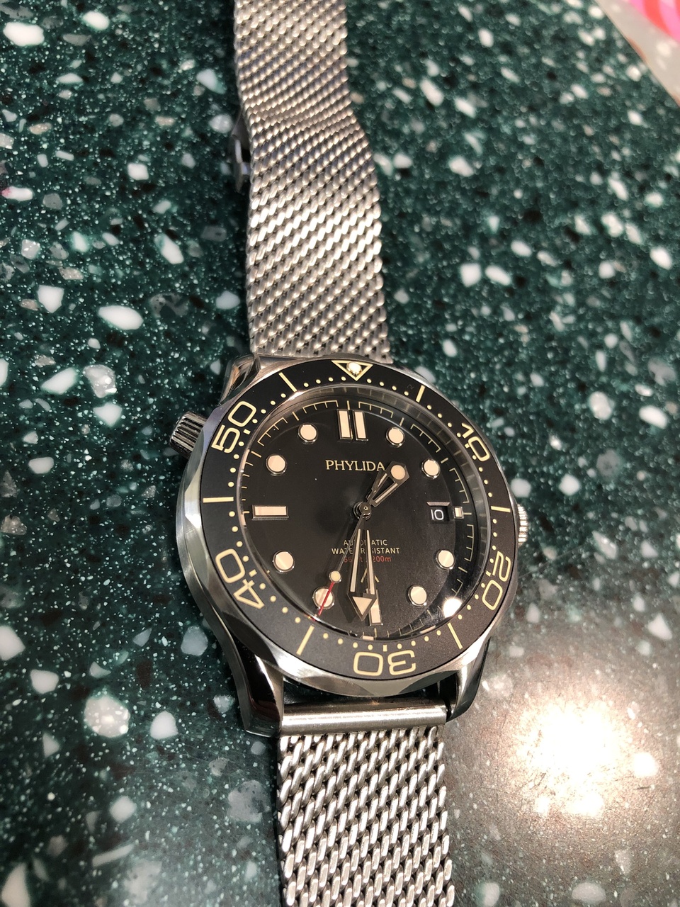 Часы очень красивые. Как мы знаем, представлены они у разных производителей, но эти подкупили черной датой (ни у кого больше не видел), гармоничными надписями на циферблате и матовым керамическим инсертом.