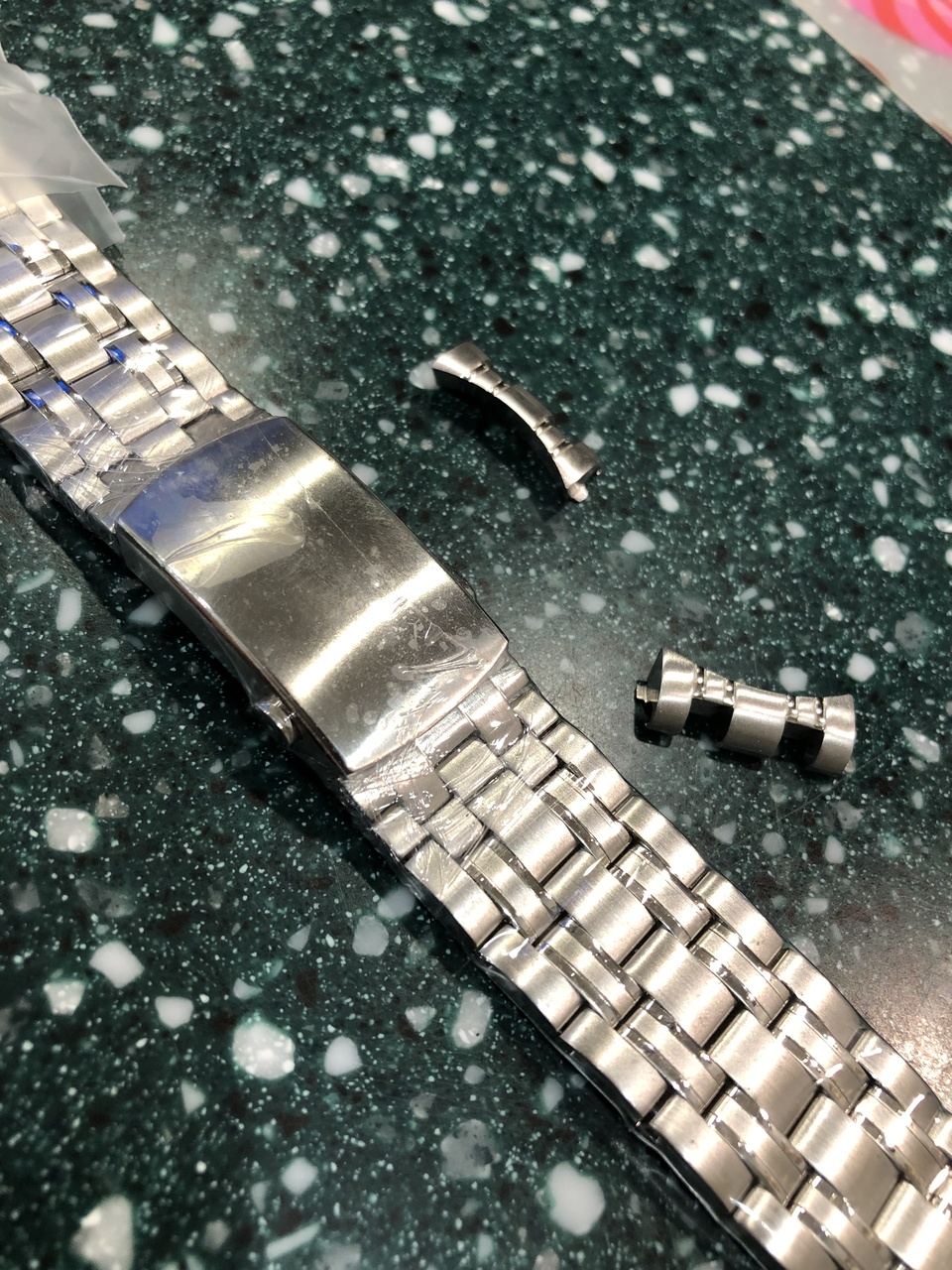 А, еще в комплекте нато был соответствующей расцветки. Но, на мой взгляд, он ни к чему: На таком нато часы Бонд носил в предыдущей серии и были они другие, а эти были в кино только на милане.