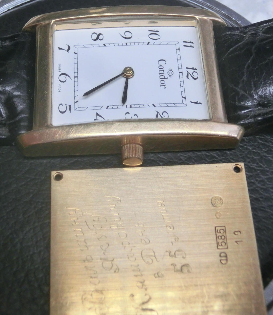 Почти все часы этой марки идут в золотых корпусах собственного дизайна, комплектуются известными швейцарскими механизмами. Корпуса могут выливаться на ювелирных заводах других стран так поступают многие не дорогие фирмы( в диапазоне цен от 500 до 5000) как результат на корпусе могут быть 2 вида проб ювелирного завода и CONDOR или 2 вида клейма CONDOR(собака) и ювелирный завод (всё зависит от страны и завода).