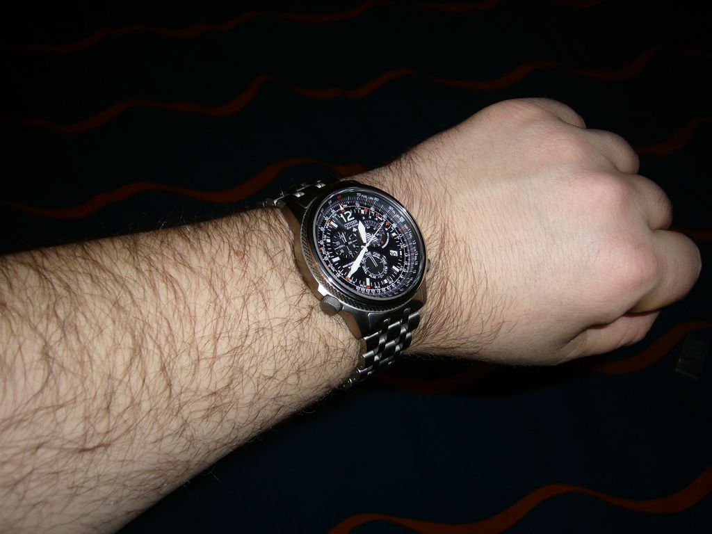 Модель полностью стальная на очень толстом кожаном ремешке с хорошей стальной защелкой, хотя аналогичные модели есть и на браслете. Но браслеты у них какие-то слишком... грубые чтоли, да и смотряться они на ремешке имхо интереснее. Также бывают титановые модели, как на ремешке, так и на браслете, хотя имхо - сталь в данном случае уместнее - весит не больше (это для моделей с ремешком, у моделей с браслетом разница уже ощутима), а царапается меньше.