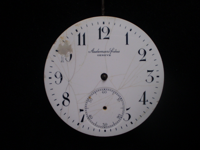 Как я понял вы москвич,там сможете подобрать циферблат в спецмастерских по ремонту часов.Другой способ дешевле и дольше,Адемар чаще попадается в золоте а золотые часы берегли,лома попадается мало.Но механизм стандартный и он закупался другими мелкими предприятиями(часто в таких случаях на механизмах не писали Адемар).Внимательно изучите рисунок мостов(или топологию не знаю как выразиться),замерьте диаметр механизма и поищите на аукционах подобный механизм с целым циферблатом,должен подойти.У специалистов внешний вид тоже ценится.Удачи!