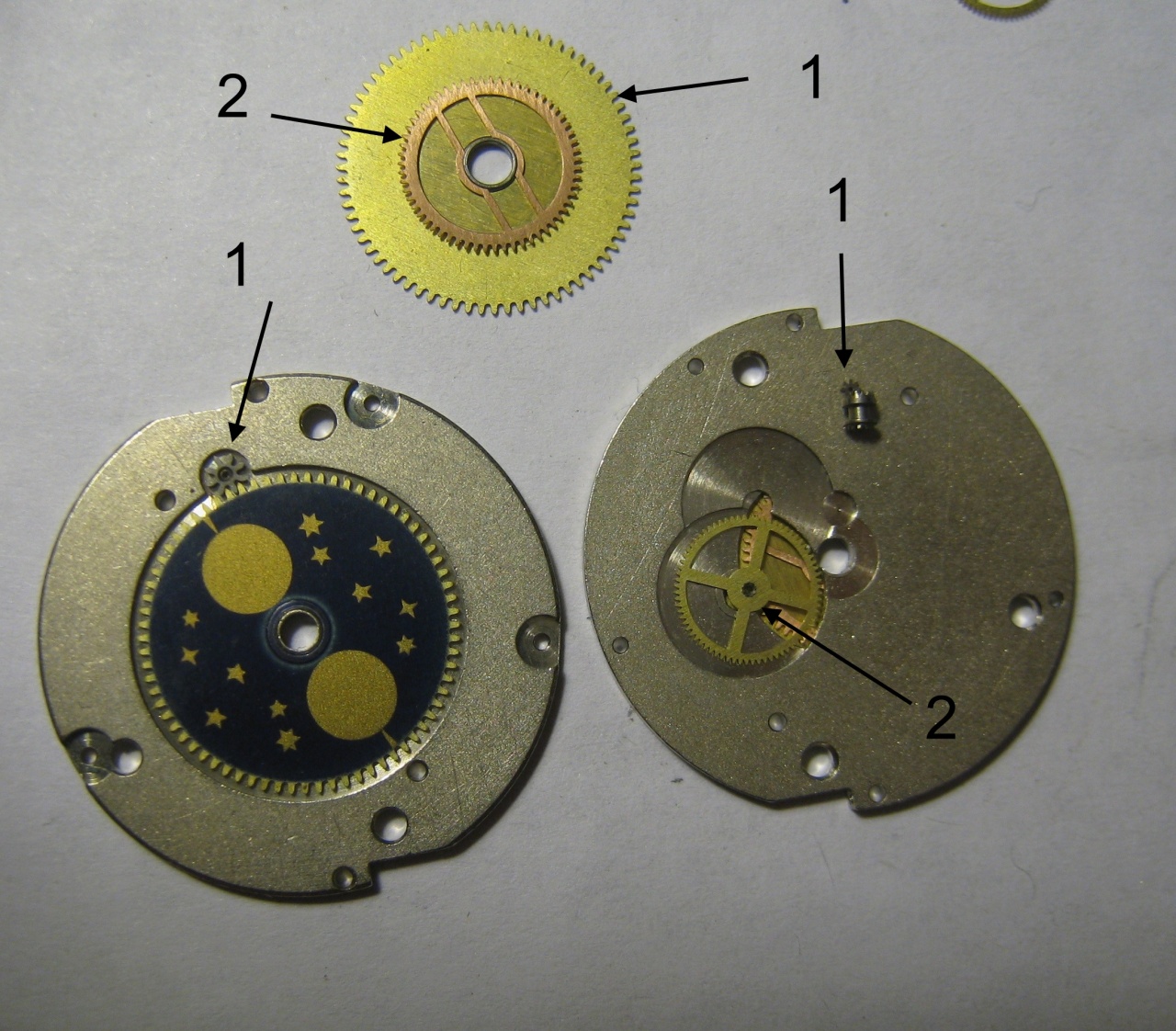 1) от ЩД (стрелки с цифрой 2 на фото) медленно от часового колеса через промежуточное колесо на систему колес лунника и на диске с обратной стороны есть колесо (зубья)