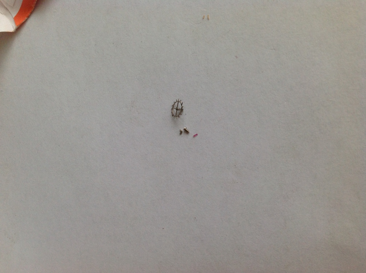 Болтик вытряхнулся со сломаным шлицем, и осколок от него, какой-то осколок красного цвета похож на 26 рубин. Ну и анкетное колесико поломатое