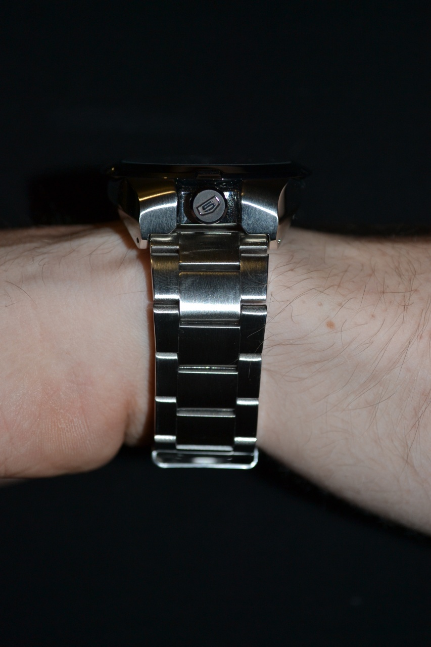 На вочюсике эту модель называют bullhead, или даже unicorn. Головка тоже послужила для меня огромным плюсом при выборе этой модели, ибо расположение ее на 12 часов означает что при сгибании кисти она не будет впиваться в руку, что для меня очень важно. Такая конструкция головки означает что она немного выдается ЗА корпус часов(см фотографии), что вызывало опасения что часы будут цепляться за одежду. Но опасения быстро развеялись когда часы были примерены с одеждой "под рукав".