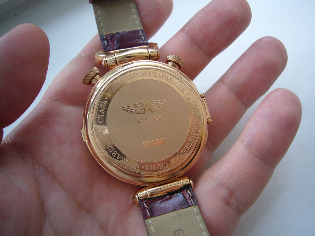 От меня одни из моих часов - недорогой, но сравнительно редкий АВИАТОР 310579-1169548 из коллекции "Винтаж", лимитка 999 экз., производитель - "Волмакс" (Москва, бывшая часть разделившегося 1 МЧЗ "Полет")