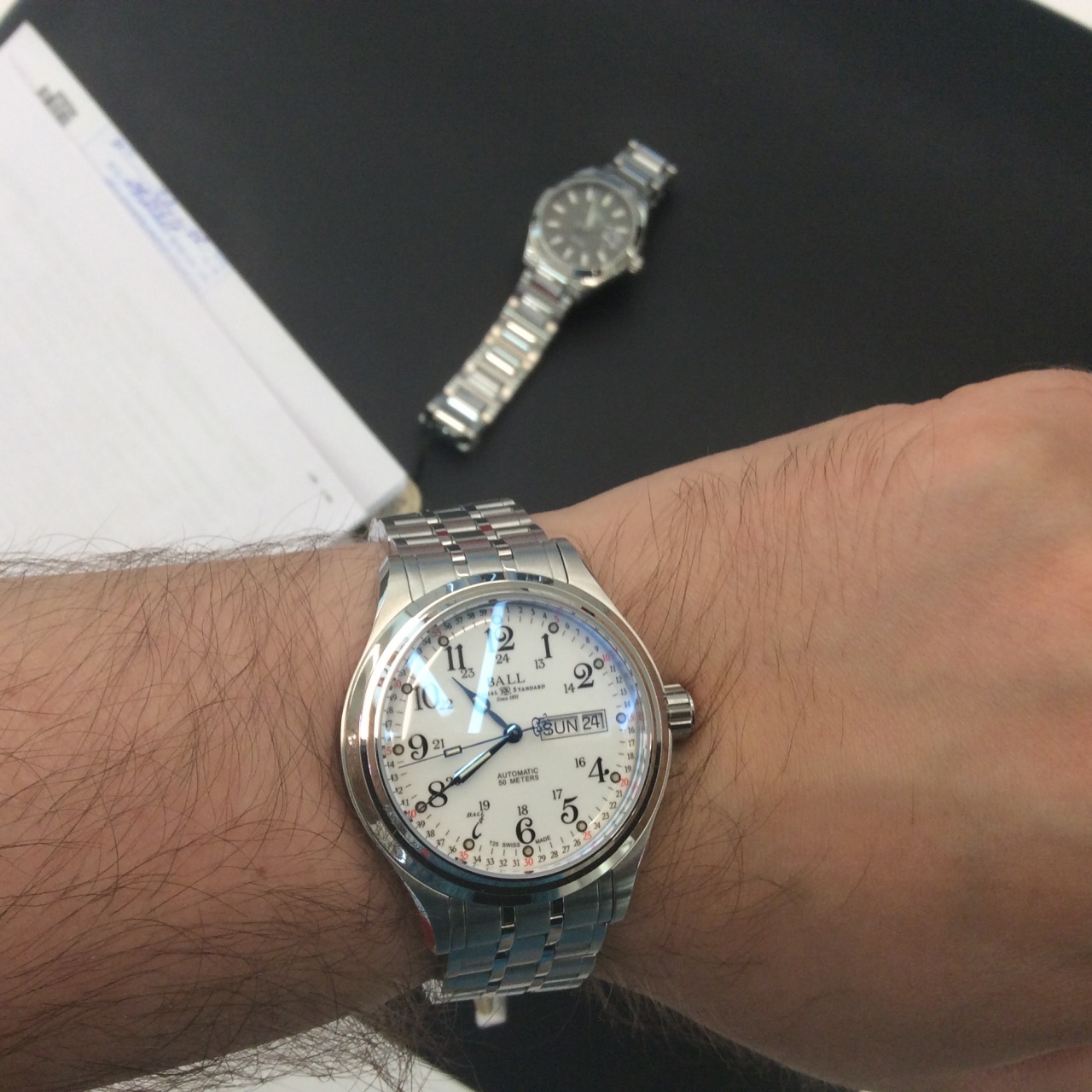 И именно на таком. Светлый, 38мм. На ремне. С браслетом не нашлись в нужную цену.