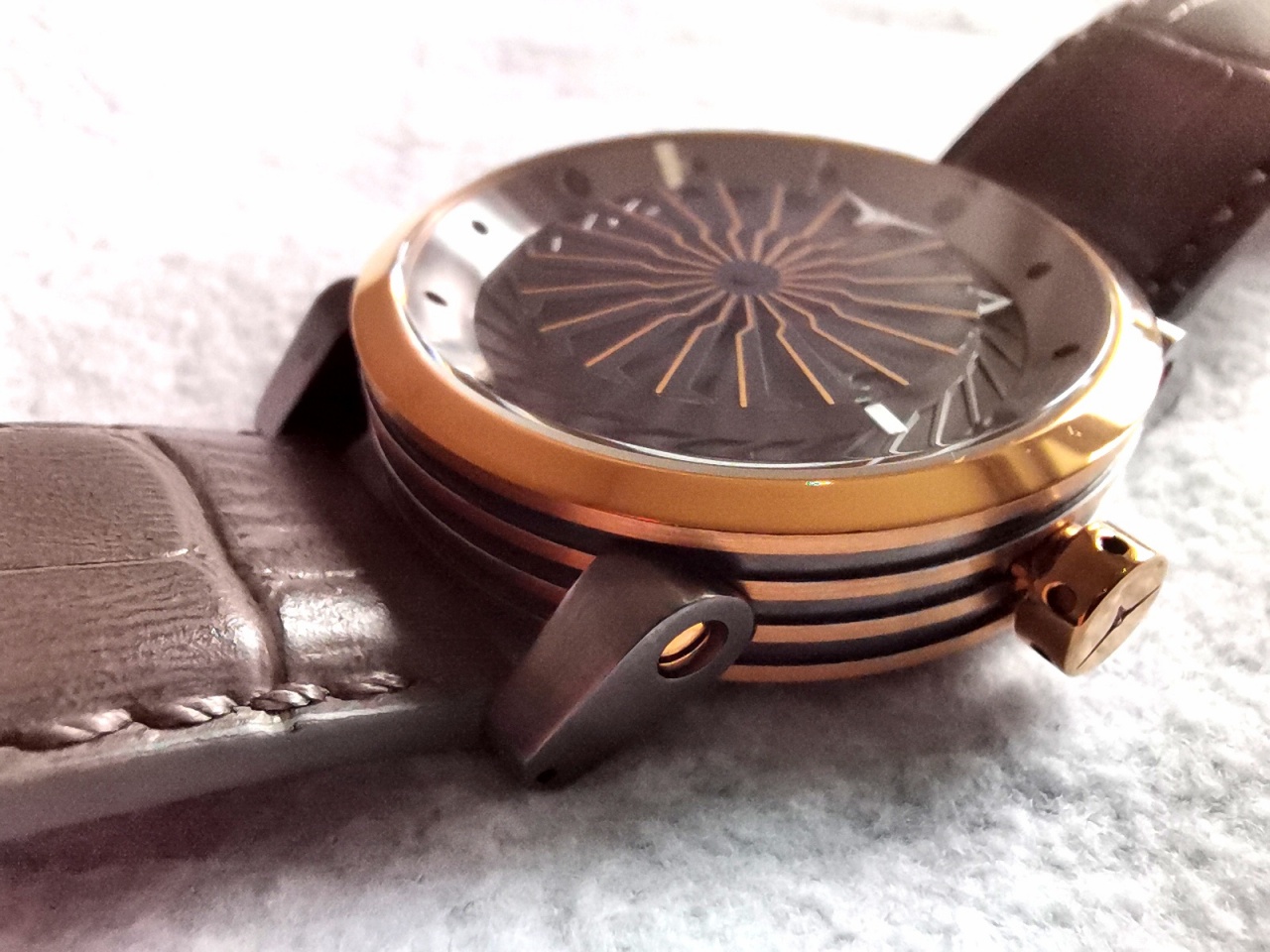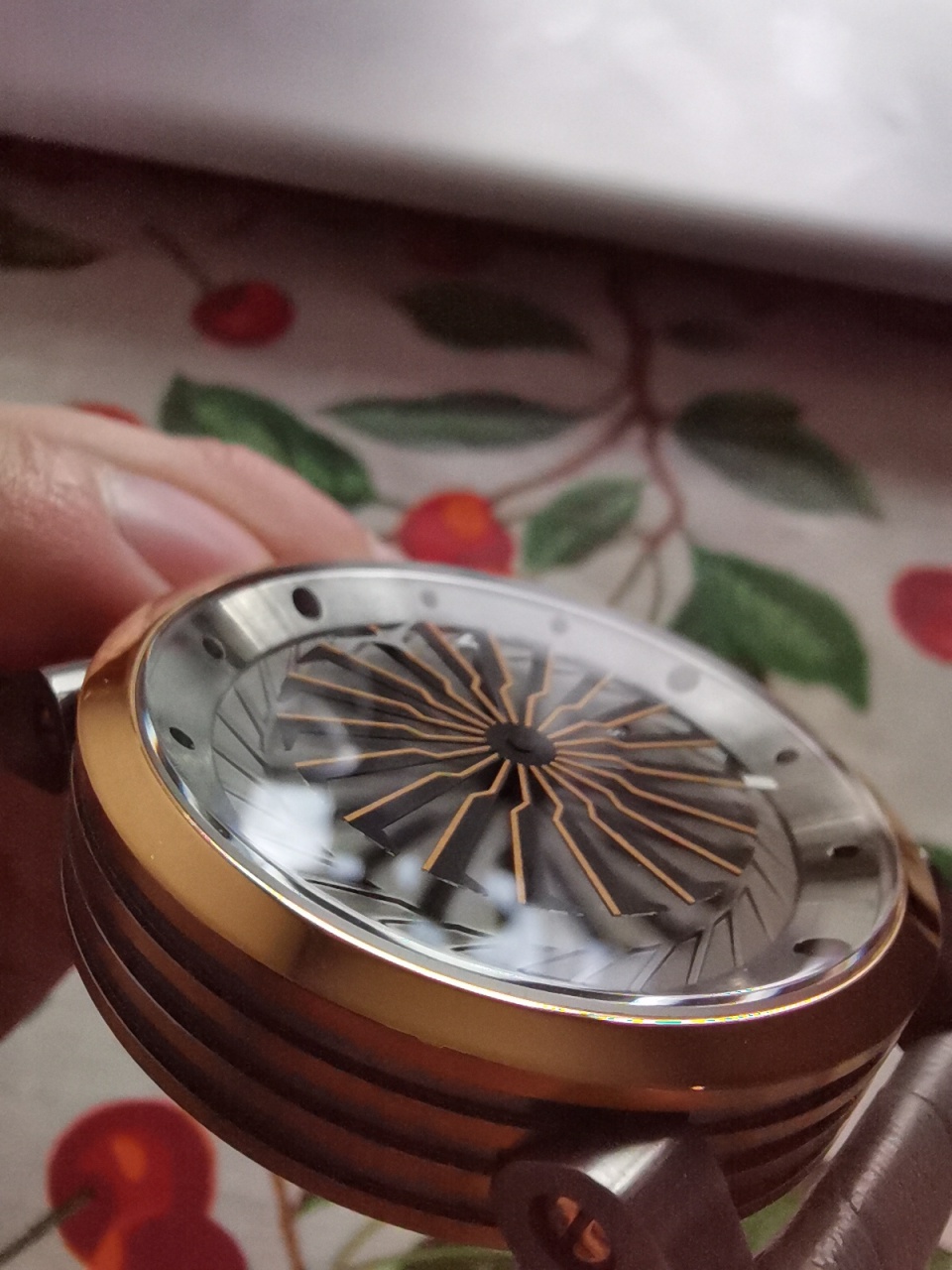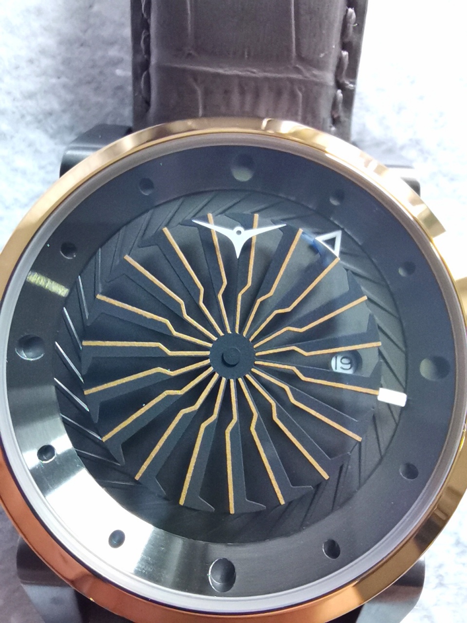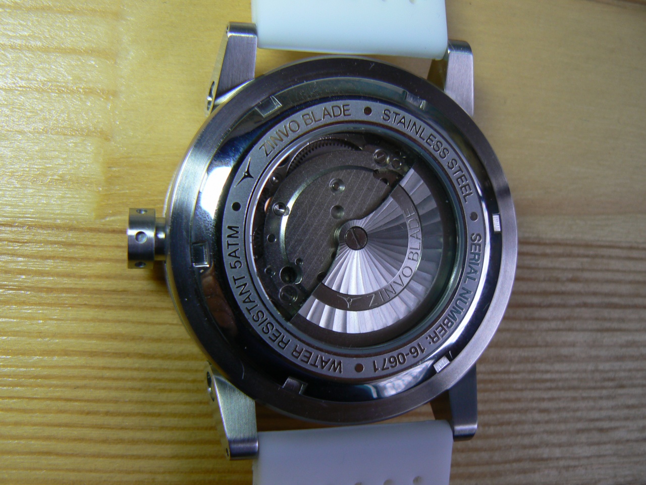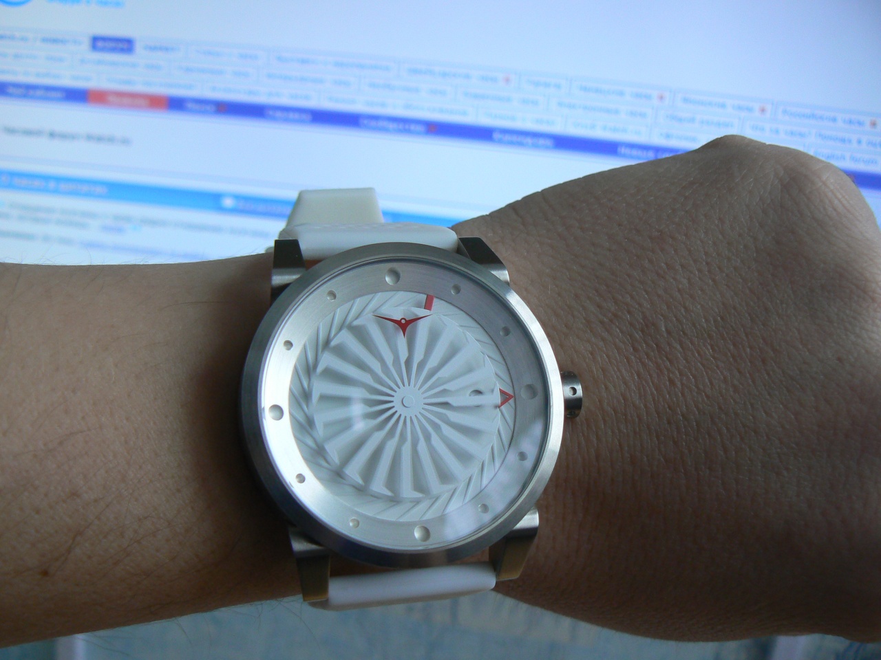 Теперь то, что не понравилось! Основная дизайнерская "фишка" данной модели - это исполнение секундной стрелки в виде лопастей турбины. Собственно функция отображения секунд в модели Blade отсутствует. На секундную ось посажен диск, с нанесёнными радиально линиями, которые во время движения (по замыслу дизайнеров) должны создавать иллюзию работающей турбины. Заявляю сразу! Замысел не удался! Точнее, диск, конечно же вращается, но... толи от того что сам диск гораздо тяжелее ипотетической секундной стрелки, толи низкая частота самого механизма - нет эффекта непрерывного движения! Диск двигается достаточно серьёзными, визуально уловимыми рывками, очень напоминая движение секундной стрелки в кварцевом механизме! И это очень напрягает. Со стороны кажется, что это именно КВАРЦЕВЫЕ часы! Видимо для полноценной реализации данной дизайнерской задуми, нужен другой механизм (или уменьшения веса диска, который выполняет функцию секундной стрелки! Получился эффект "стопорящейся турбины"