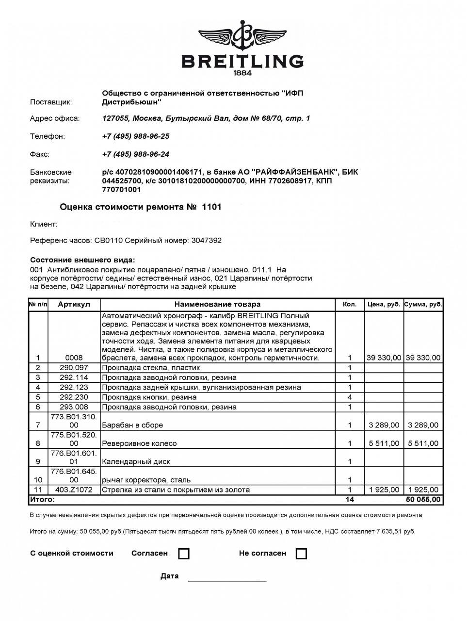 Российский сервис/центр Breitling в цену полного сервиса (39 900 р.) включает:
