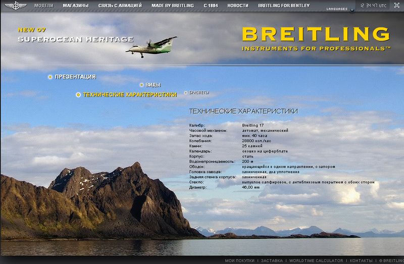 Уже зарекомендовав себя профессионалом в создании инструментов для пилотов, в 1957 Breitling впервые начинает завоевание морских глубин, выпуская модель Superocean. Эти часы для дайверов в монолитном корпусе и с армированным стеклом, что обеспечивает им водонепроницаемость до 200 метров (660 футов), обладают исключительными техническими характеристиками. Изначально созданные для профессиональных и военных дайверов, и прежде всего для специальных войск, часы Superocean вскоре нашли признание у любителей подводного плавания. Спустя годы, Breitling обогатит эту линию еще более совершенными моделями, как простыми, так и хронографами, водонепроницаемость которых уже достигает 500, 1,500 и даже 2,000 метров.Поколение моделей Superocean выгодно отличается своими невероятными техническими функциями, а также функциональностью и хорошей считываемостью циферблата. Сегодня, Breitling отдает дань этому морскому инструменту, создавая модель Superocean Heritage, часы для дайверов, часы, абсолютно подходящие для водной стихии.