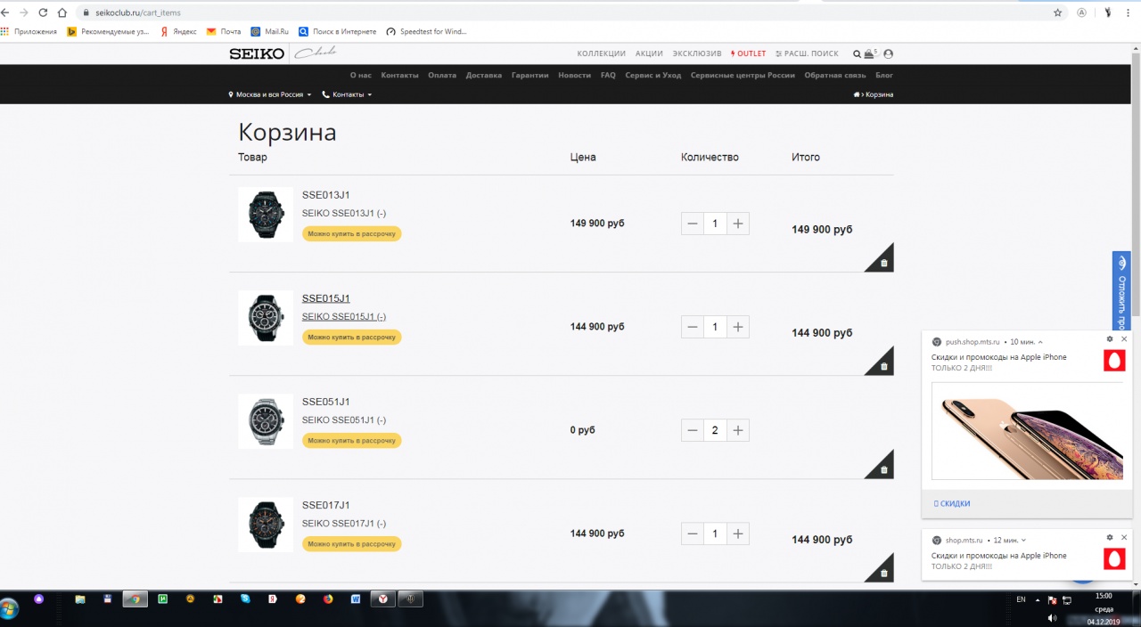 При оформлении заказа я убрал поочередно три (!) из 4 пар часов и итоговая сумма всякий раз корректно (с учетом цены в "0 руб" на SEIKO SSE051J1) менялась.
