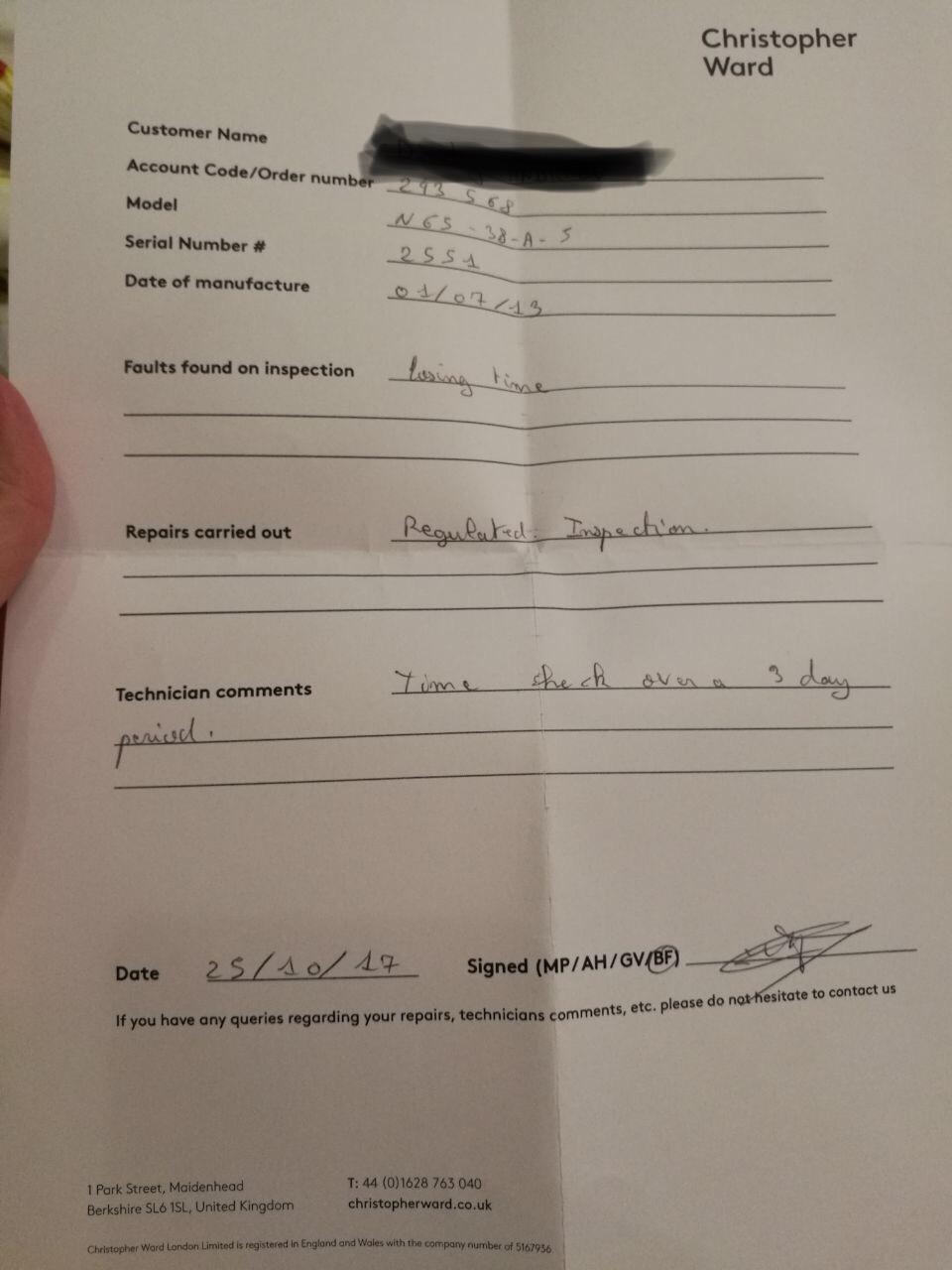 Так вот, заказал я себе данные часики во время летней распродажи из раздела «почти новые» со скидкой 30%. Надо отметить оперативную доставку - около 10 дней. Часы сразу понравились. Купольное стекло, снятые полированные фаски по бокам корпуса, в общем исполнение на высоте. Но вот мне откровенно не повезло с механизмом. Часы из коробки отставали на 20-25 секунд в сутки. Думал приработаются. Но в дальнейшем мех только сильнее стал отставать. В итоге после некоторых раздумий, когда отставание могло доходить до 40 сек, решил отправить часы на регулировку. Надо сказать, что сервисом Варда, в этой части, я остался не доволен. Часы дошли до Англии быстро - чуть более недели, после получения от Варда не было известий. Выждав неделю решил поинтересоваться все от ок, дошли/не дошли, ну что-то вроде этого... Дня через три ответили что «да, получили», но попросили написать через неделю чтобы уточнить сроки ремонта. Подождал, написал. В ответ срок - 4-5 недель и будет мне счастье Хороший такой срок на регулировку хода. Ну что делать, жду. Как и было обещано через 5 недель прислали трек номер посылки. Получил коробку со странным листом из сервиса. Серийник не от моих часов, дата производства часов странная - 01.07.2013. Ну что сказать, к этому моменту к небрежности сотрудников Варда я уже привык, подумал, что перепутали тупо. На мой уточняющий вопрос в сервис никто не ответил ну и ладно, думаю, главное ведь теперь часы в порядке! Ан нет отставание никуда не делось. Беда... часы ведь нравятся. Ещё очень расстроило что расходы по пересылке Вард возвращал очень долго, и буквально пришлось чуть не уговаривать. Переписка с сотрудниками растянулась недели на две. В итоге вернули, даже два раза два разных сотрудника, что тут скажешь. В общем бардак да и только. Посчитал второе возмещение компенсацией морального ущерба