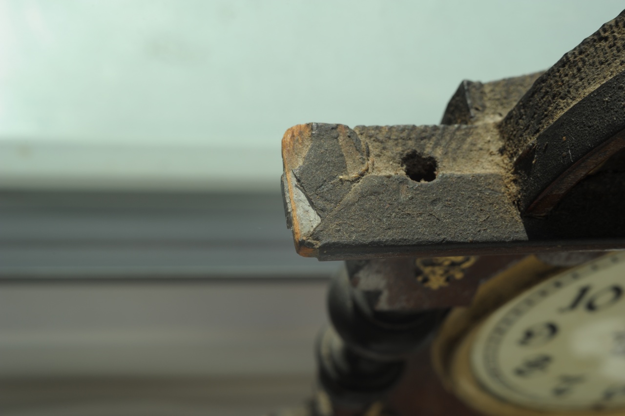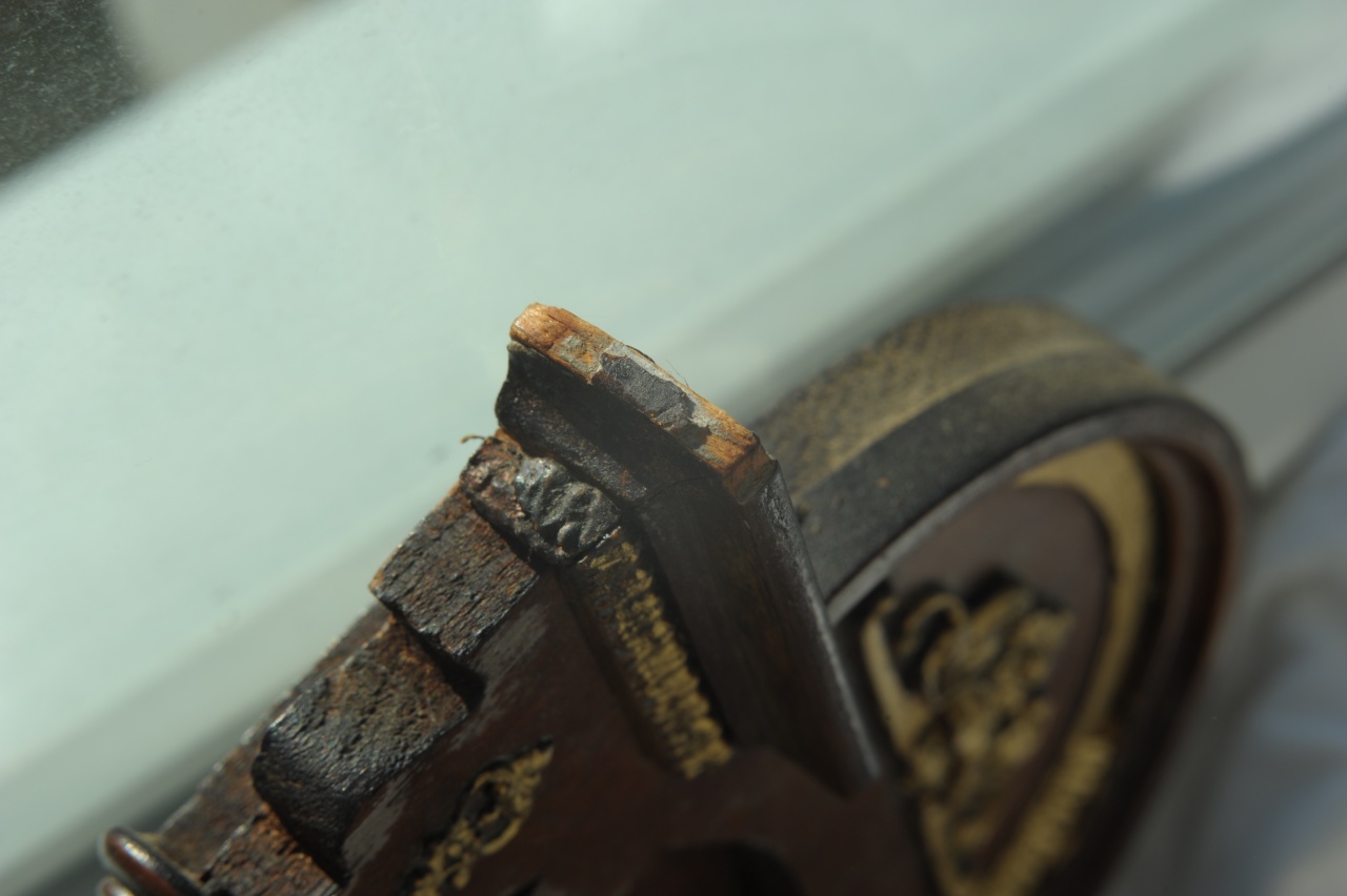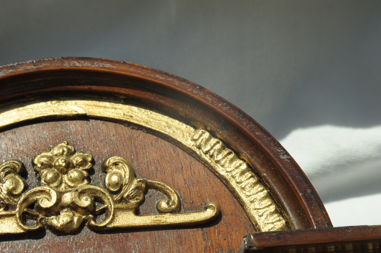 Мне видится что декор у Вас изготовлен из неметаллических материалов (сургуч например), в крайнем случае верхняя полукруглая накладка,иначе не могла отвалится часть декора. И соответственно в Вашем конкретном случае он (декор) приклеен , я опять же и крепжа не вижу (шляпки гвоздей) , поэтому если он нигде не " пошатывается" то лучше его не трогать , т.к. велика вероятность его сломать.
