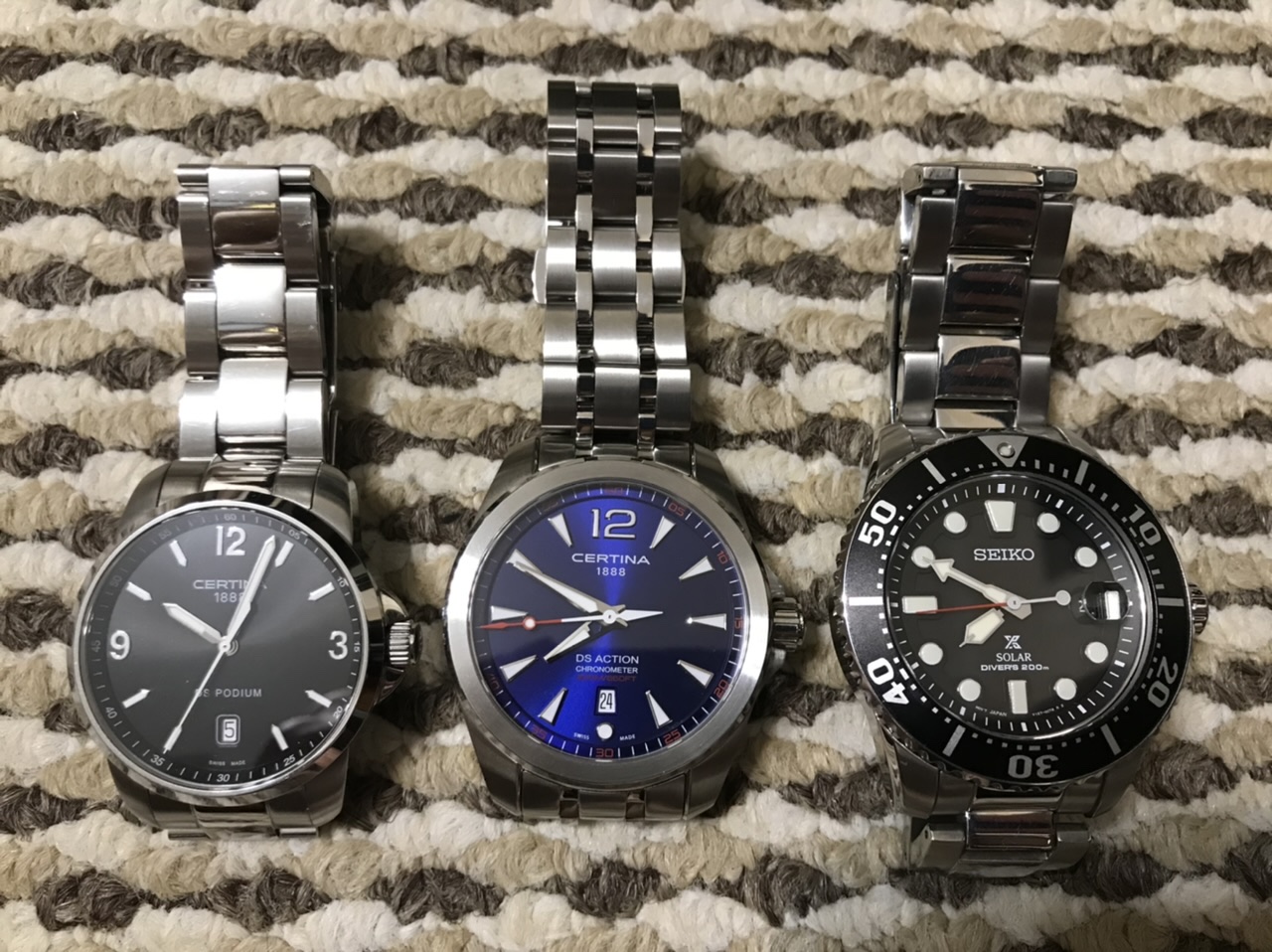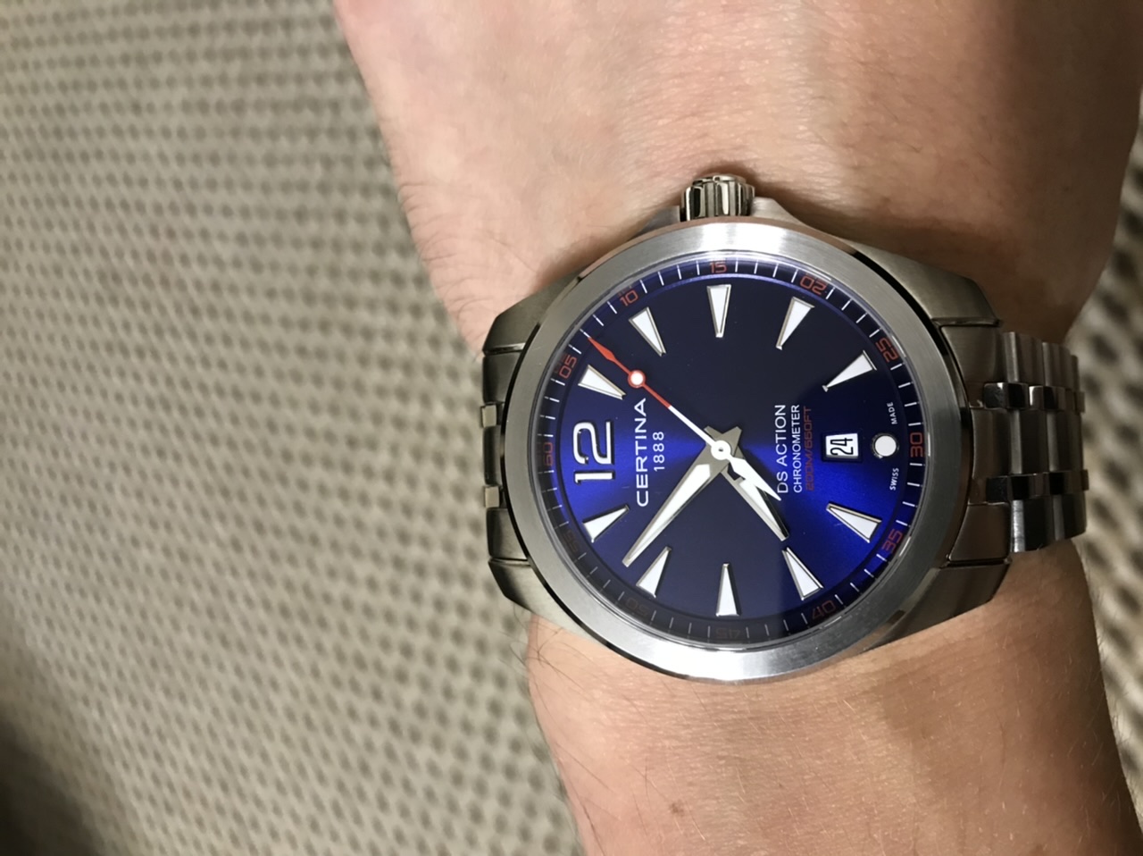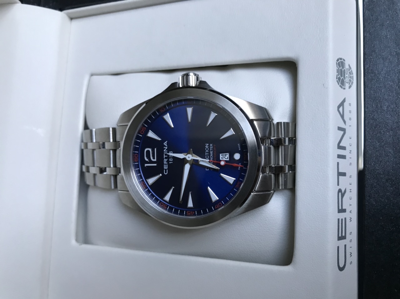 Купил себе с синим цифером такие часы. Сначала сходил посмотрел, померил. Играющий на свете синий циферблат, накладные метки притягивают взгляд, на часы охото смотреть) читабельность отличная! Браслет тоже понравился он литой, «гибкий» и как бы обтекает руку. Сталь часов и браслета 316, сапфир, WR 200, завинчивающаяся ЗГ, черепаха на крышке)) всё это для меня плюсы + скидка в 4000р.) Отталкивала «дёргающаяся» секундная стрелка, и причём такая ситуация на всех кварцевых часах Certina и Tissot, которые были в салоне. После пары дней раздумий часы купил) Ношу их неделю, впечатления только положительные! Секундная стрелка идёт по меткам, только когда стрелка «дрожит» на левой стороне цифера, немного не попадает в метки. Люм светит вроде долго, но он не такой яркий как на seiko или citizen. Фото прилагаю