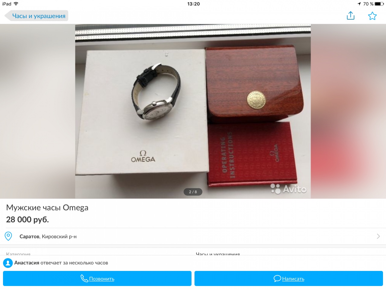 Пишу, что есть знакомый человечек в Чехове, готов забрать в руки, в ответ письмо, что часы уже в резерве и уже оплачивают более расторопный покупатель.