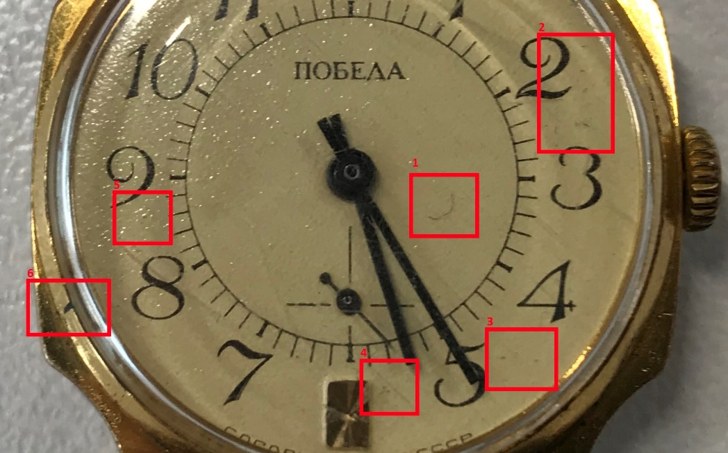 На циферблате также отметил дефекты, до замены стекла был в идеале. Цифра 1 - очень похоже на волосок, висит на одном месте много лет, наверно, наэлектризовался. Хотя может быть и царапиной. Остальные цифры - предположу, что следы от рук, либо следы от стола, на который положили циферблат. Цвет - очень похоже на темно-синий