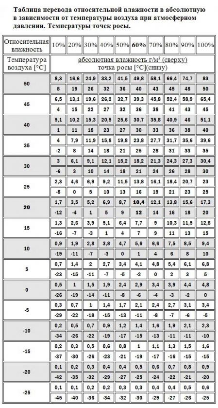 Чтобы не быть голословным, посмотрим таблицу соответствия трех параметров: температуры (0С), относительной (%) и абсолютной (г/м3) влажности.