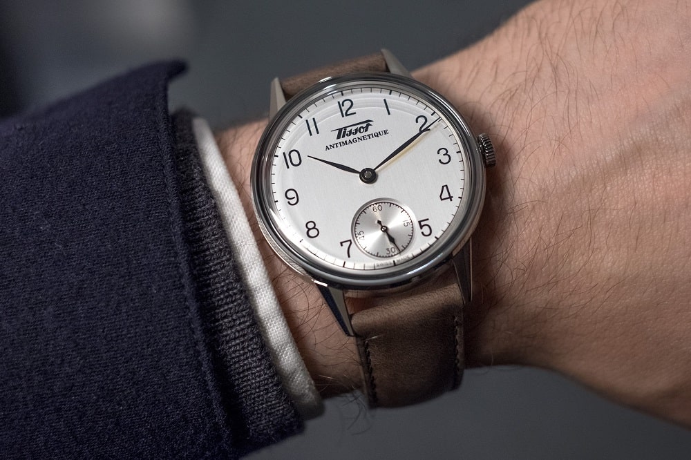 TISSOT Heritage Hand Wind T119.405.16.037.01 42мм, на Вашу руку должны хорошо сесть. Есть мелкоцифер, но это, просто, секундная стрелка вынесена на отдельный циферблат. На джоме 480$+небольшая таможня+доставка.