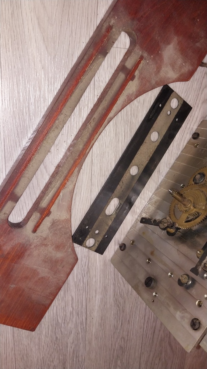 Экземпляр оказался крепким, добротным и абсолютно не изношенным. Историческая его достоверность ни внутри, ни снаружи не нарушена. Ход и обе системы боя стабильно работают с подобранными минимальными массами своих гирь. Излишек снятых разновесов составил в сумме вес более 2 кг, и это весьма хороший объективный признак здоровья механизма. Часы прекрасно звучат в момент боя, что в принципе дано не каждым, и имеют при этом четкий однородный ход. Знаю это по своему опыту работ по разным типам часов с боем. Стало быть, все то смутное, неопределенное (и тем страшное), в их жизни уже осталось в прошлом. Ближайшая и не спешная с ними работа – профилактически подтянуть навеску двери для ее свободного хода в проеме башни корпуса над порожком. И изготовить по образцу аналогично «родному» тот самый крюк – гайку для приведения в соответствие подвеса гири четверти.