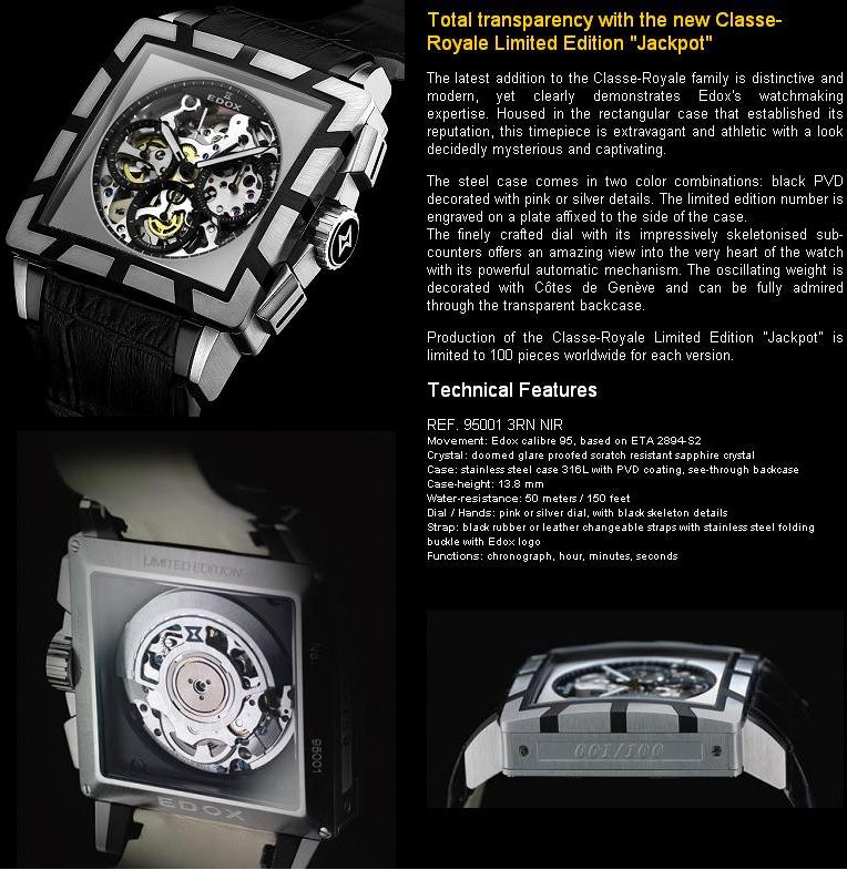 К семейству High Elegance относится и коллекция Classe Royale, с триумфом прошествовавшая по планете два года назад. Сложный составной квадратный корпус, мощный и дерзкий, многообразие функций в самых разных сочетаниях покорили всех поклонников марки и завоевали сердца многих из тех, кто до этого даже не знал о существовании Edox. Женская круглая модель Royal Lady также не осталась не замеченной публикой. В особенности лимитированная и бриллиантовые версии коллекции.