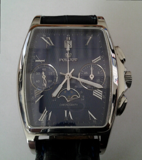 Мой поход окончился покупкой отечественного хронографа от Макарова на механизме 31679. Не сразу я пришел к этому решению. Сначала я на него не обратил внимания, а по привычке заинтересовался стандартными хронографами с большим круглым корпусом. Но захотелось нечто не круглое и желательно с лунным календарем. И тут я заметил эти часы… но они не смотрелись. Поразмыслив, я понял причину – браслет! Литой браслет из нержавеющей стали совершенно не подходил к этим часам. Тут же в магазине взял кожаный ремешок, приложил его к хронографу, и произошло перевоплощение гадкого утенка, часы стали совершенно другими, подошел коричневый цвет, с черным они не очень…