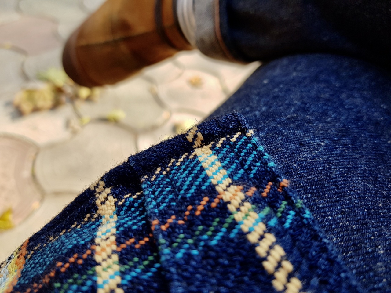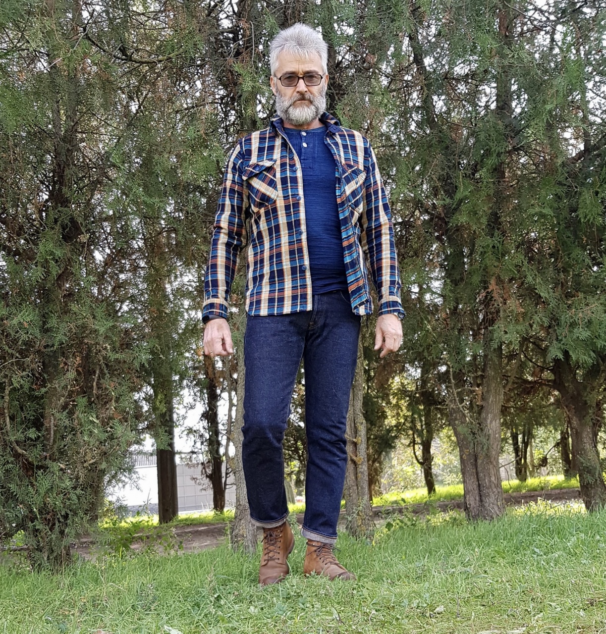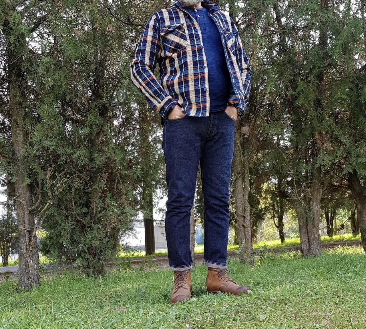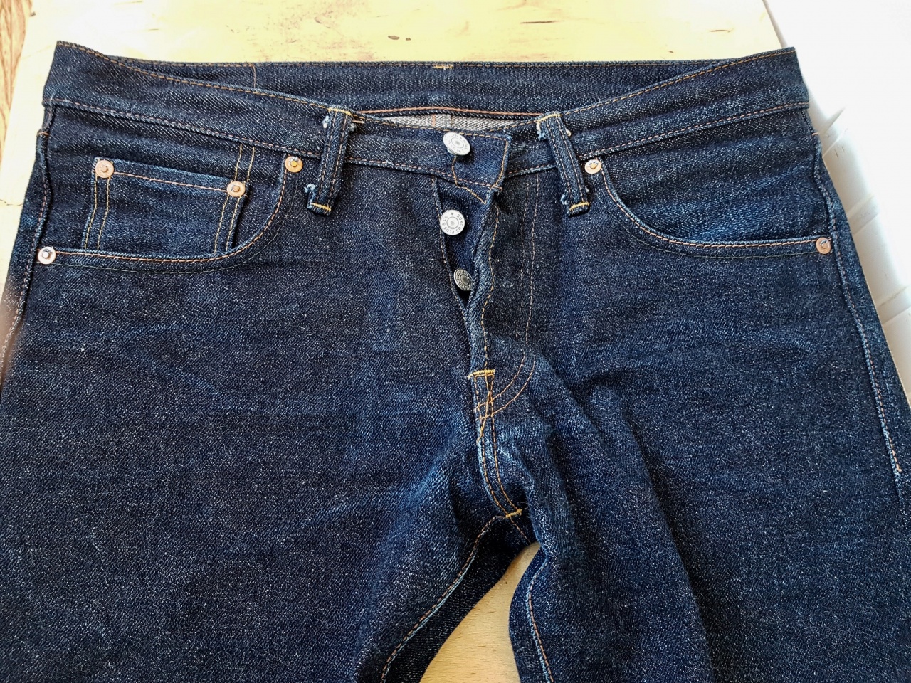 Собран деним плотно , тактильно «тянет» поболее 16 унций , окрас густой насыщенный до фиолетово-чернильного , фактура шершавенькая с массажным эффектом , уникальный уток в серых тонах ... замечательный деним , фэйдовый потенциал огненный !