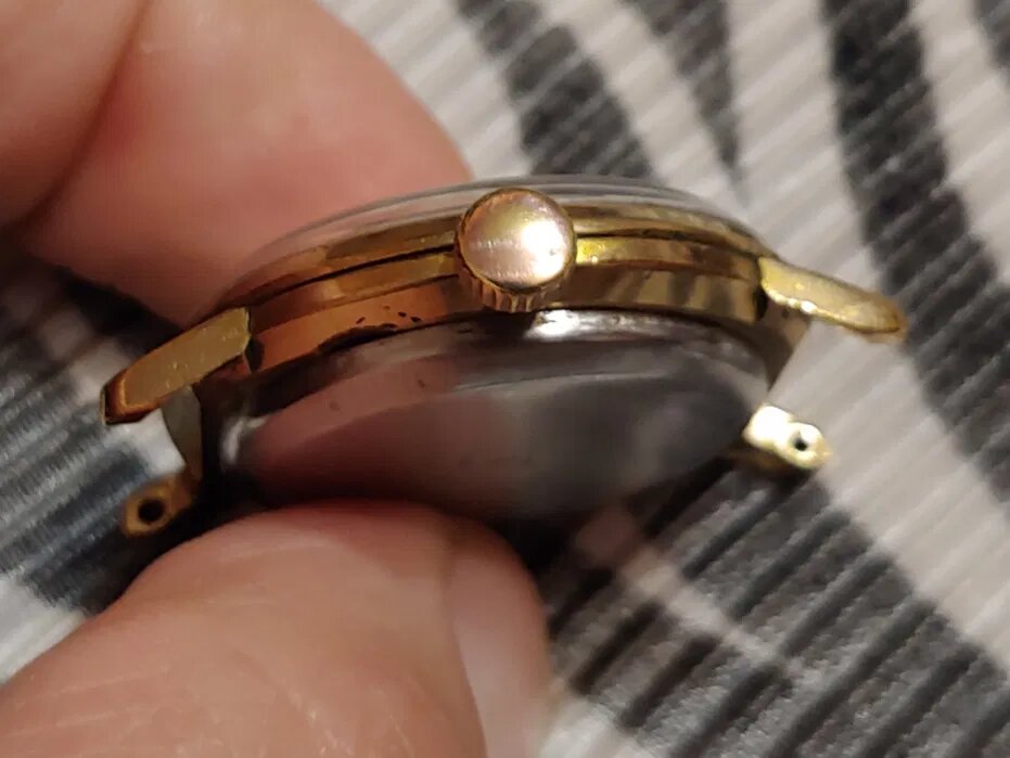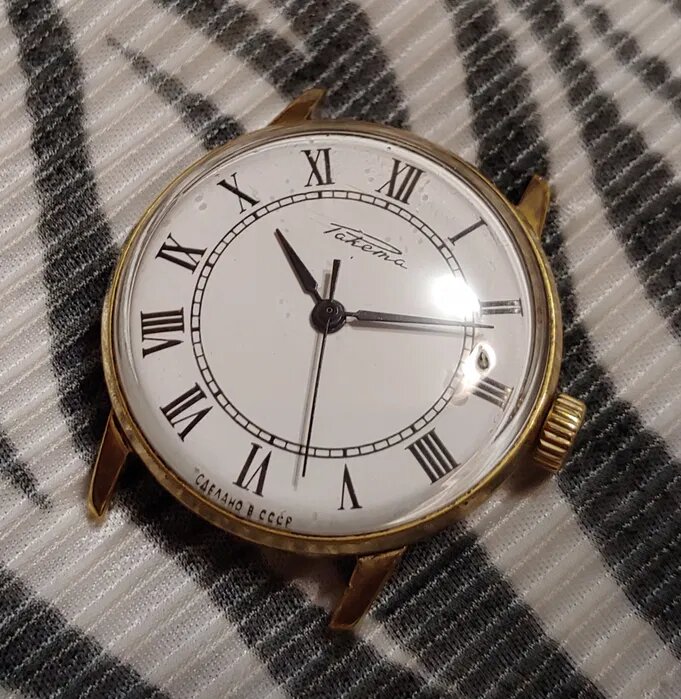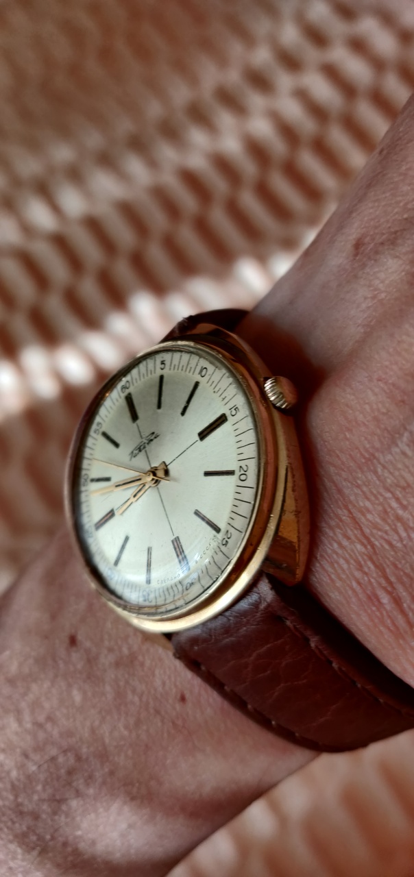 Поставил ремешок-напульсник чтобы визуально увеличить часы на руке, так как ширина корпуса всего 33 мм. Получились отличные винтажные часы в состоянии новых!