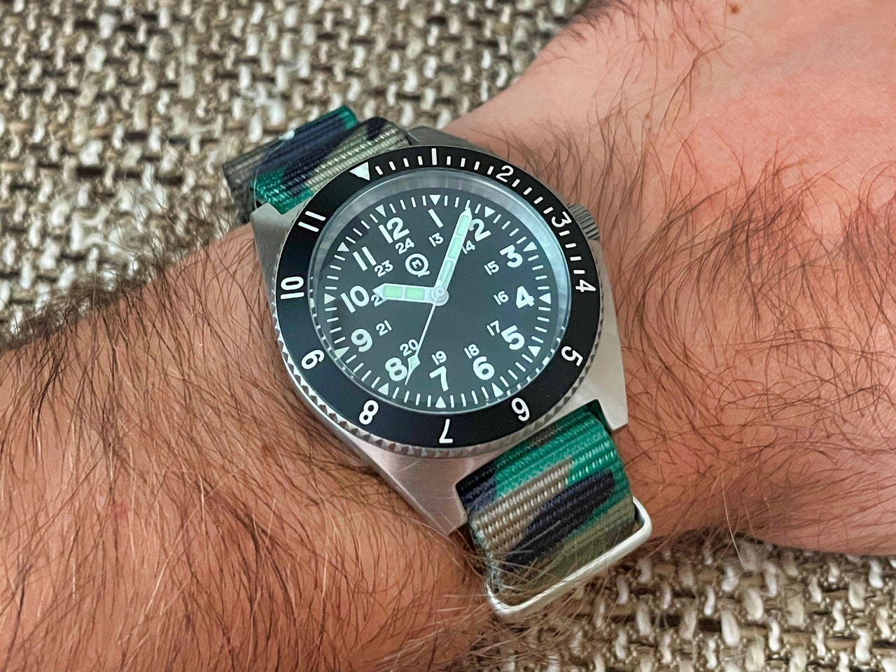 Косяка у них, по большому счёту, ровно два: надписи на крышке сделаны вверх ногами и внутри на стекле было что-то типа масляного тумана. С первым ничего не сделать (ещё на пол-оборота не затянуть, а отвернуть на пол-оборота — протекут), а второй легко исправляется: раскидал, вытер стекло, собрал обратно. Да и косяк это сборщика, не конструкции. А в остальном...Стекло толстое, железяка корпуса мощная. Обработана без изысков, просто аккуратно. Безель щёлкает так, как будто трещотка вот-вот испустит дух, но люфта при этом нет, вставка ровно по меткам оказывается — и 120 щелчков в наличии. Маркировки сделаны подобно оригинальным, насколько это возможно: военная спецификация, реальное название производителя, дата изготовления. Натовские номера заменены на нейтральные метры и стальную сталь.