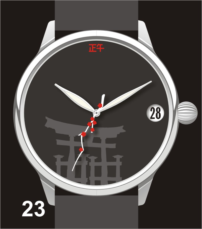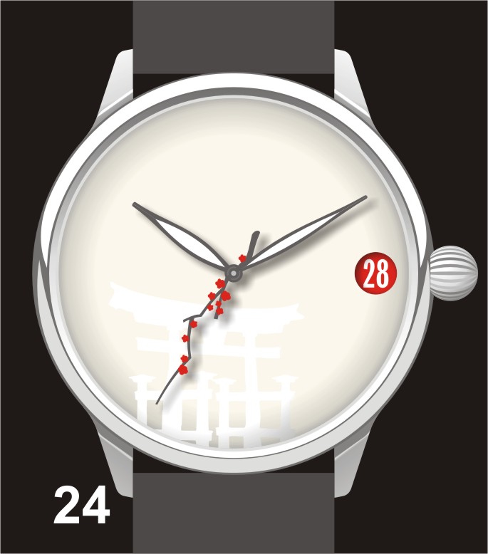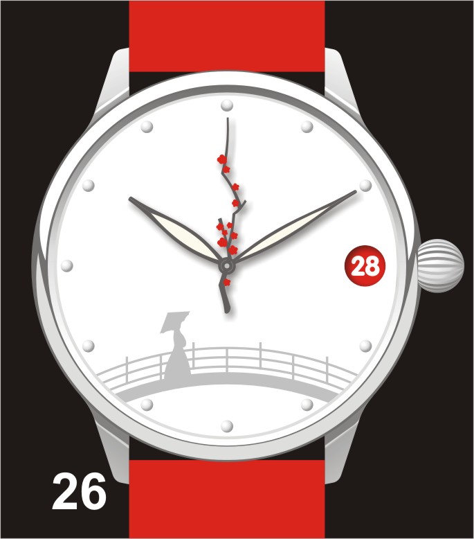 Главное, в процессе создания дизайна, не скатиться к образу девчачьих часов за 500 рублей. Пока большинство решений выглядят именно так, к сожалению. Может быть стоит отказаться от всяких картинок, на циферблате? Сделать его серебряным, к примеру или цвета слоновой кости. Сделать часы более строгими. С уклоном в "винтаж". Идея с японскими мотивами безусловно хороша, но если её можно реализовать лишь аляповатой картинкой, может стоит отказаться от неё, или обозначить гравировкой на задней крышке или ЗГ, баклей и т.д. ...