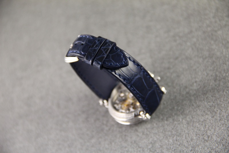 Ремешок для часов Arnold & Son "Hornet History Collection James Cook". Верх ремешка сделан из кожи аллигатора. Подкладка ремешка из кожи теленка. Перенос металлических вставок в основание ремешка. Ремешок прошит вручную.