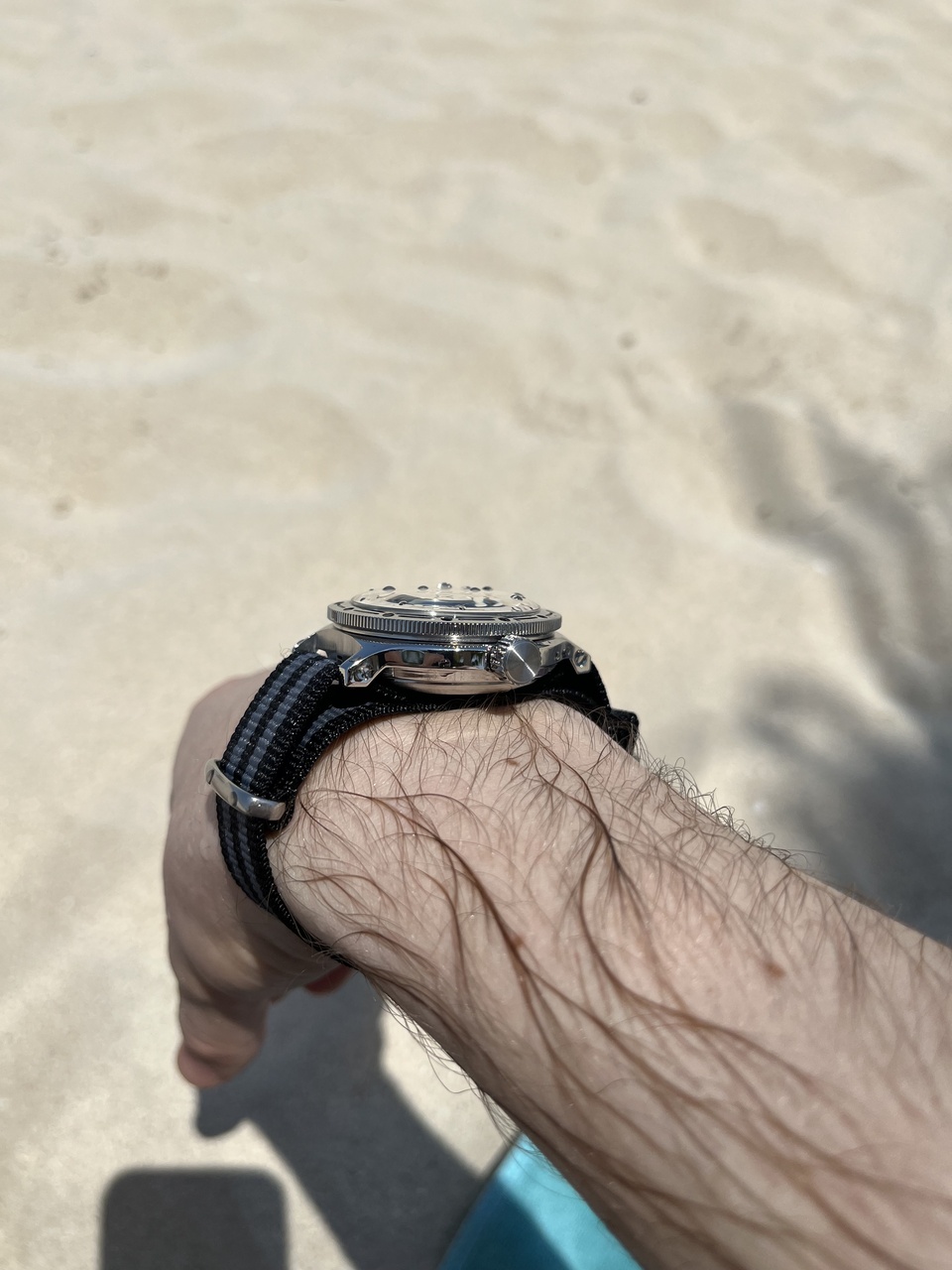 Этакий образ из Джеймса Бонда “Dr. No”, где у него были Ролексы на тонком ремешке нато нарочито меньшего размера чем ширина ушек.