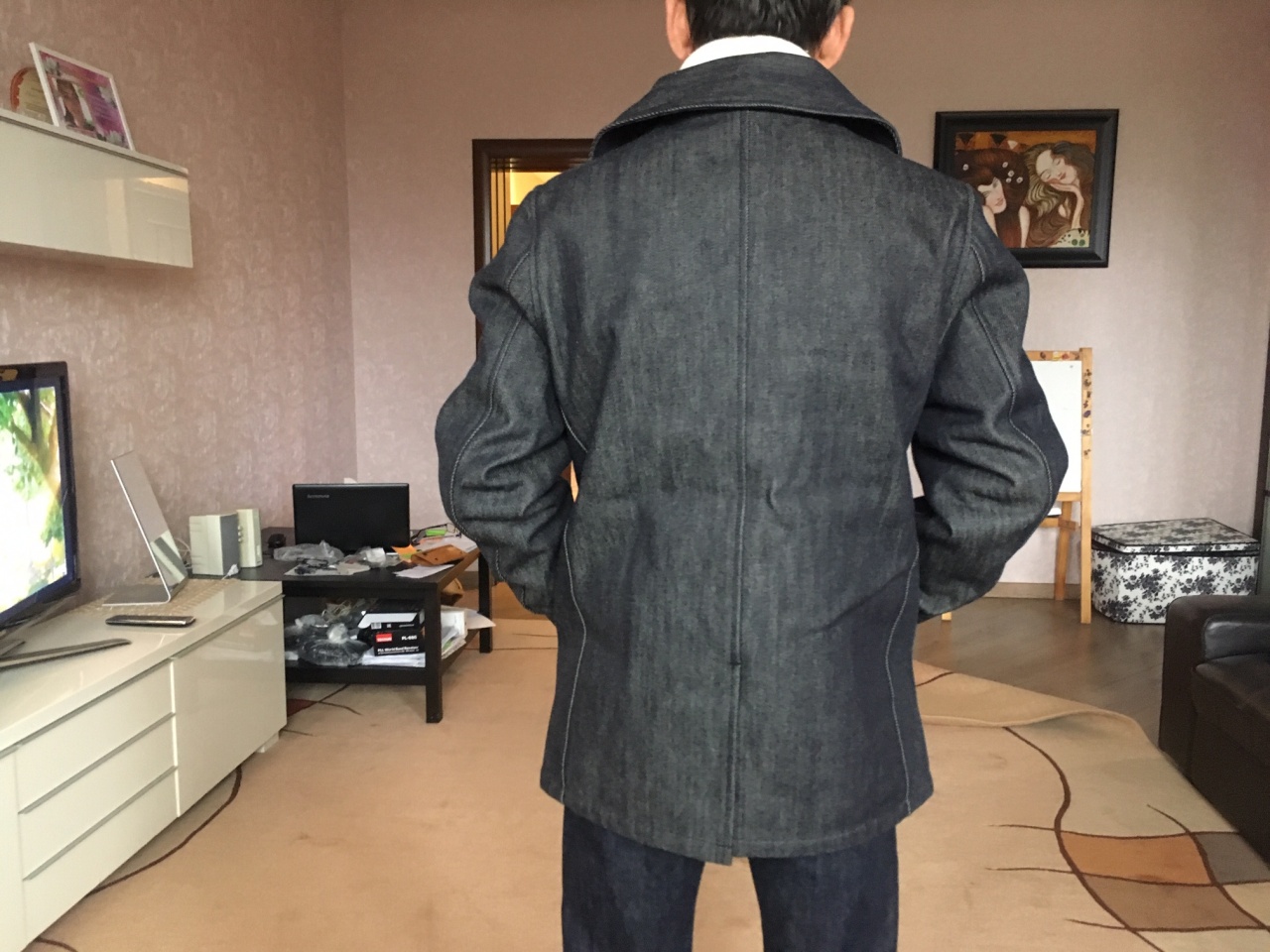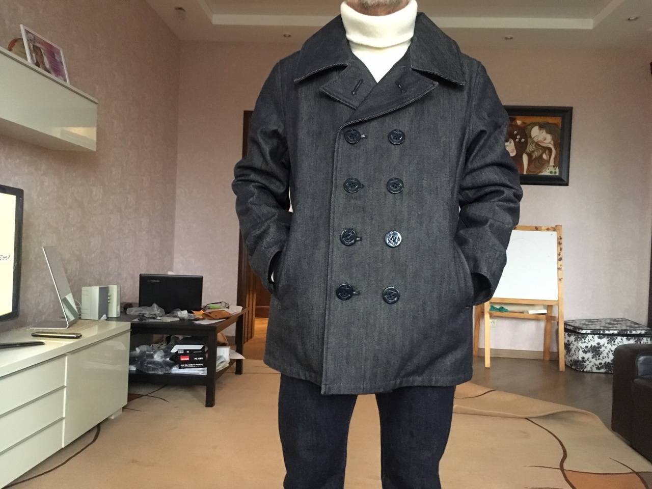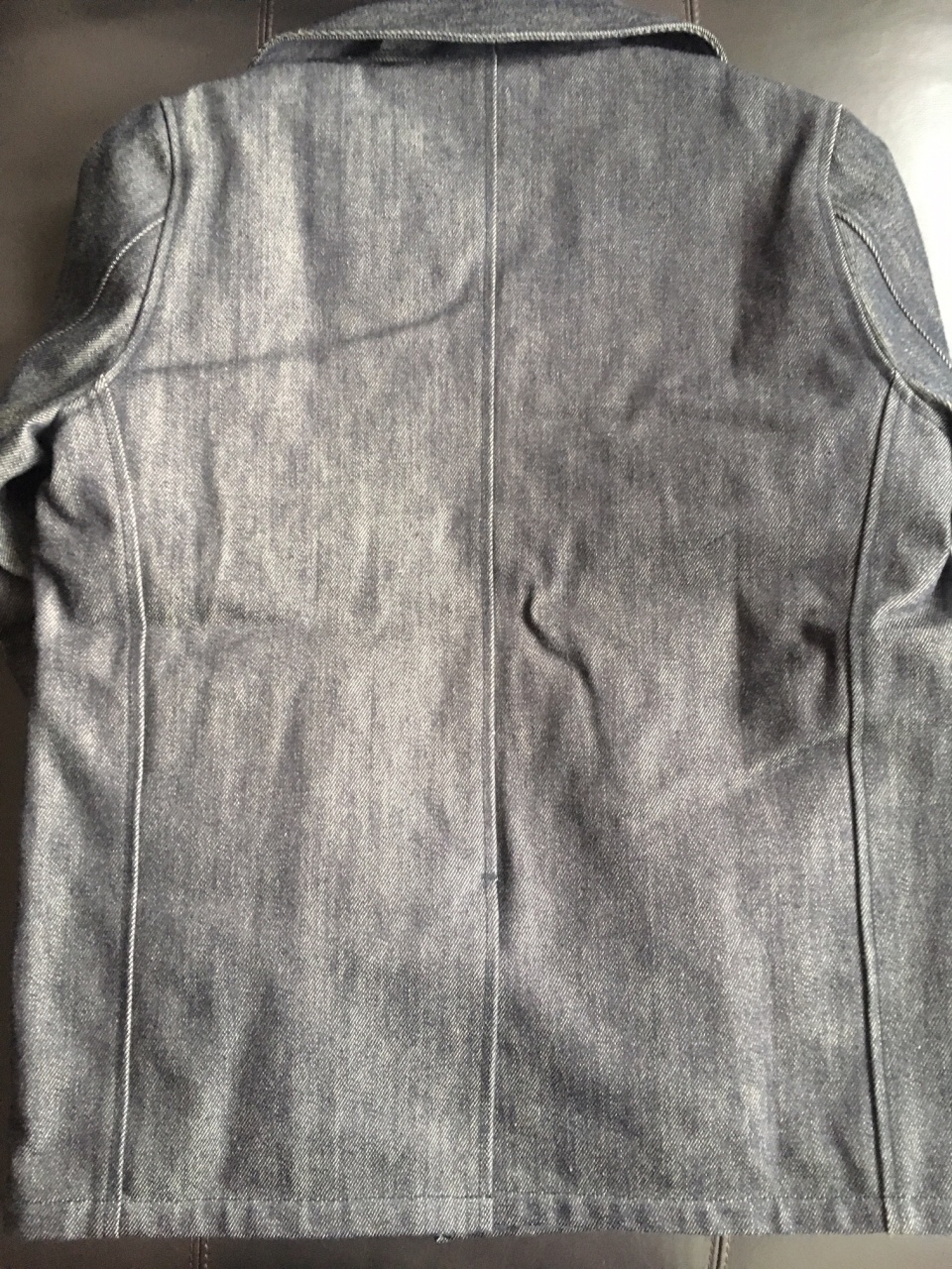 21 унцовый фирменный санфор-деним бушлата отдаёт в серый, т.к. немытый, на фото по сравнению с моей жилеткой IH-526SV. Из пакета деним в меру жесткий - по ощущению такой-же как на моих 634S-21, когда я их из пакета доставал.