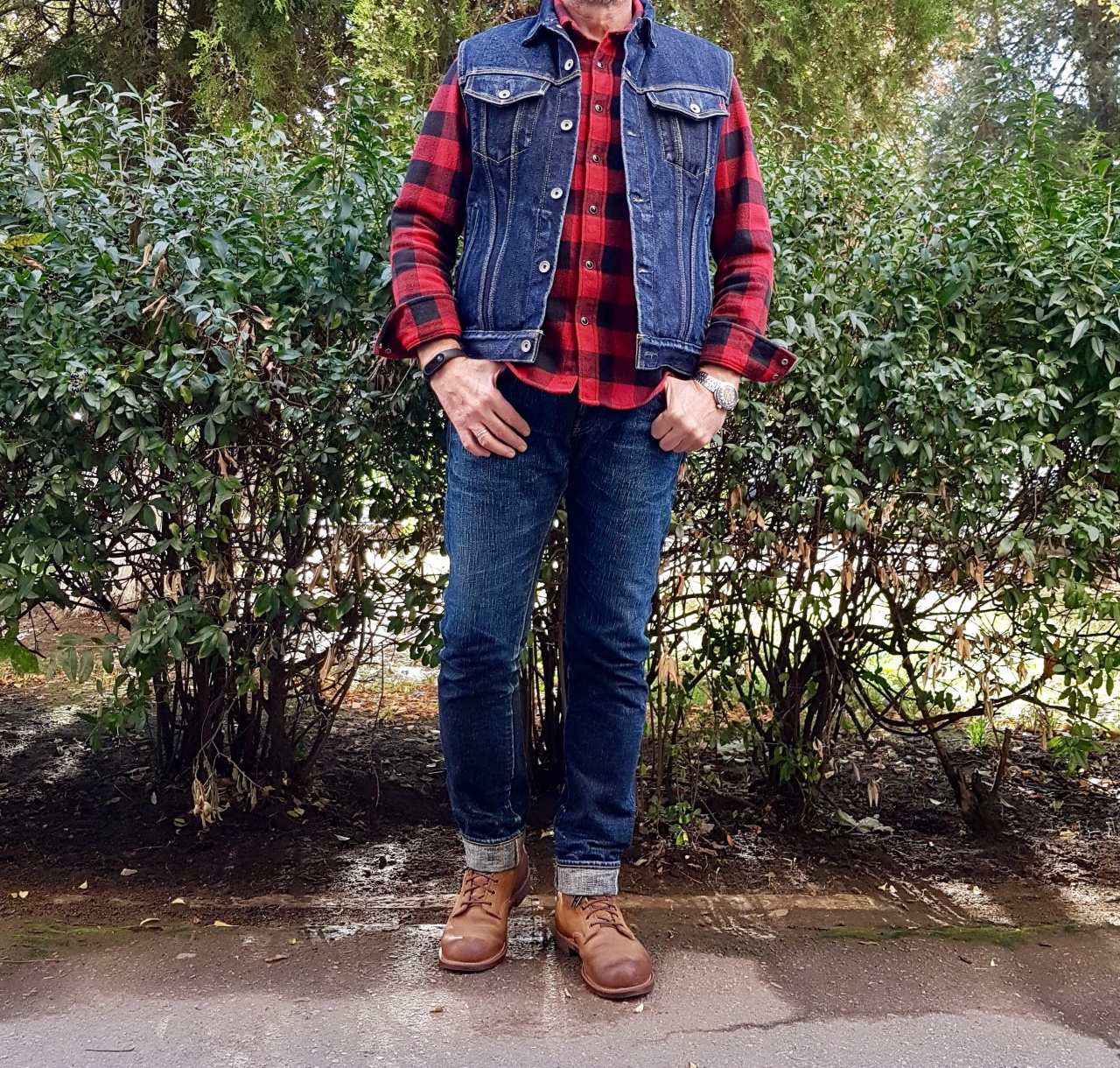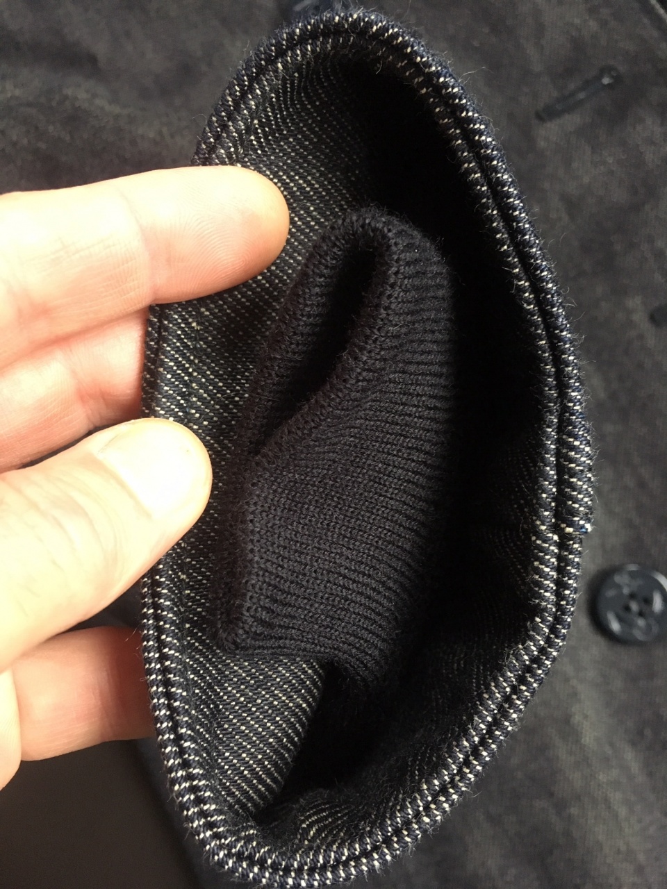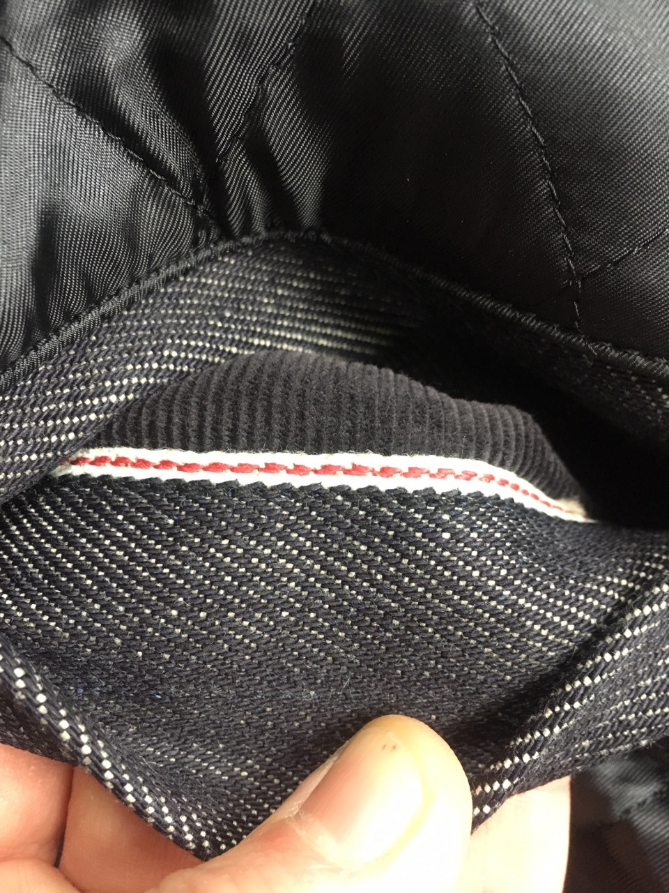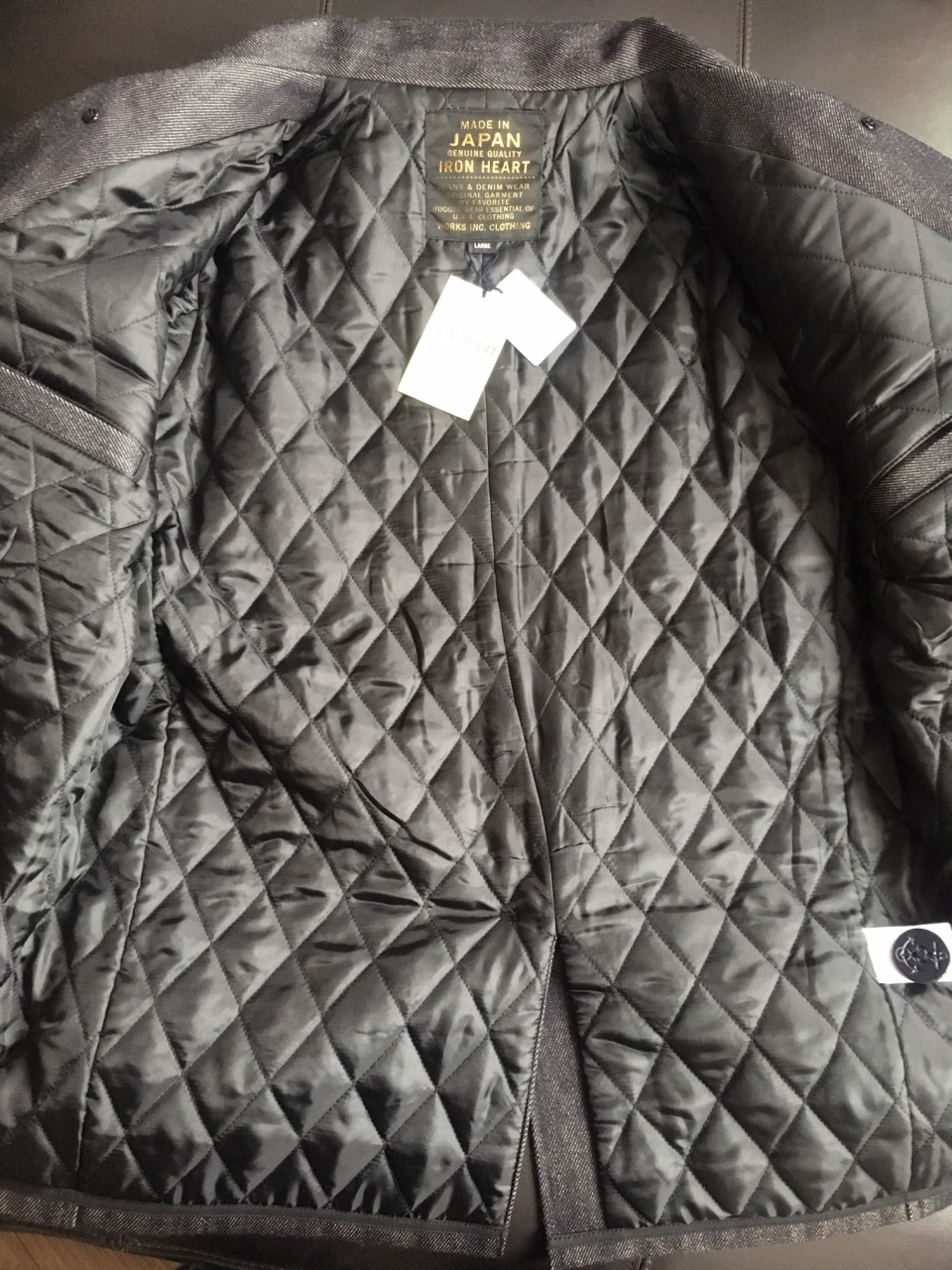 21 унцовый фирменный санфор-деним бушлата отдаёт в серый, т.к. немытый, на фото по сравнению с моей жилеткой IH-526SV. Из пакета деним в меру жесткий - по ощущению такой-же как на моих 634S-21, когда я их из пакета доставал.