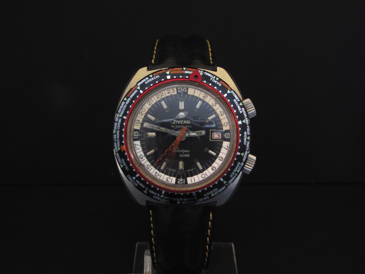 Enicar Sherpa Guide. В таком состоянии найти практически невозможно. Никто не хочет продавать. Посмотрите на безель, на кольцо с меткой, которая ломается и стачивается со временем. Корпус полировался, секундная стрелка не идеальна, но это мелочи. Стекло и стрелки найти гораздо легче. У кого будет желание, посмотрите Jet Graph и Aqua Graph. Охи они изумительны! Но цены я не потяну!