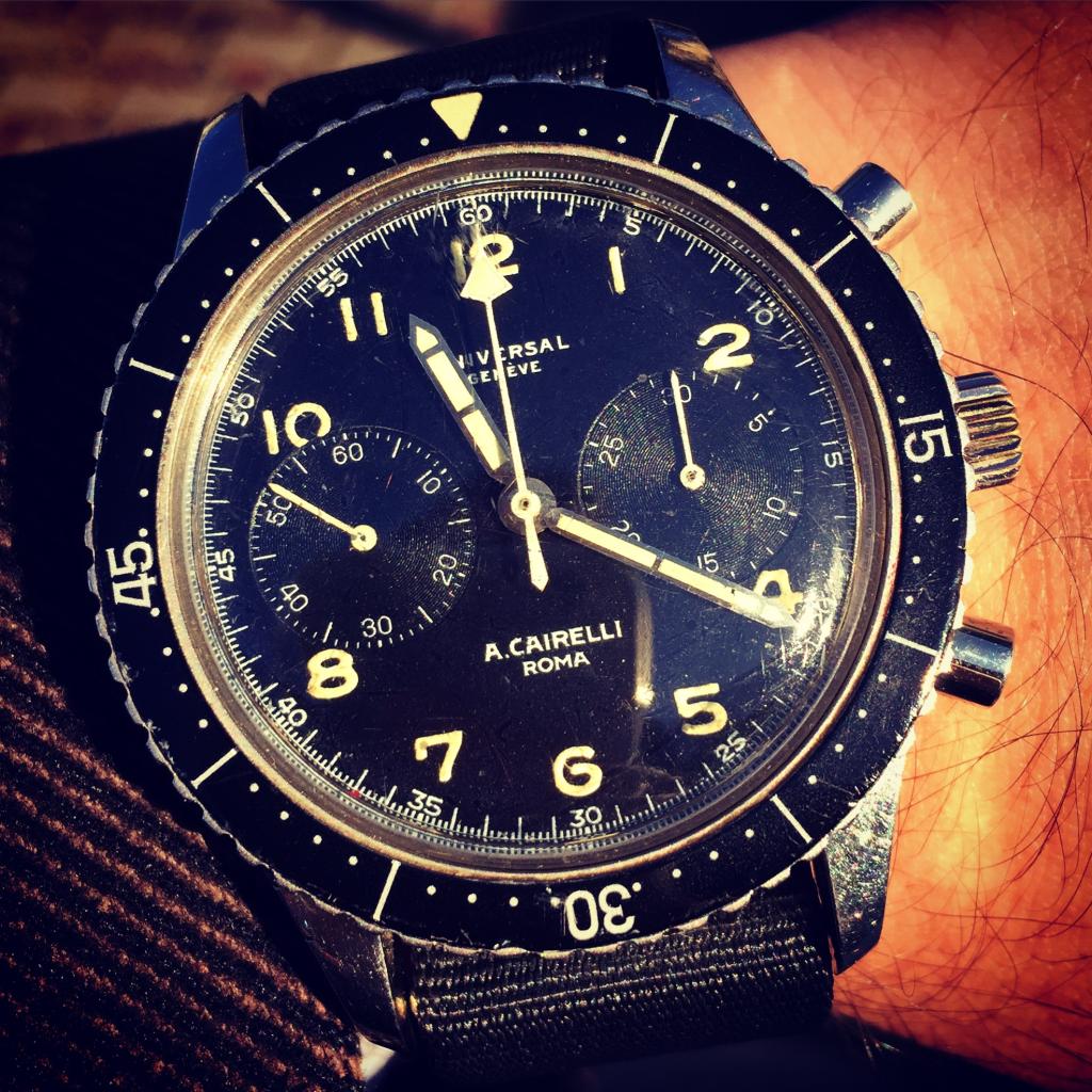 В свое время ВВС Италии заказал хорошие часы у A.Cairelli, который являлся единственным поставщиком и который, как и многие ритейлеры того времени (Tiffany, к примеру) ставил свое имя на часы рядом с именем марки. После выпуска Cronometro da polso tipo 1 совместно с Breitling и Leonidas, A.Cairelli совместно с Universal Geneve и Zenith выпустили увеличенную в размерах до 43 мм версию хронографа CP tipo 2. Кстати, удачи в поисках с UG версией