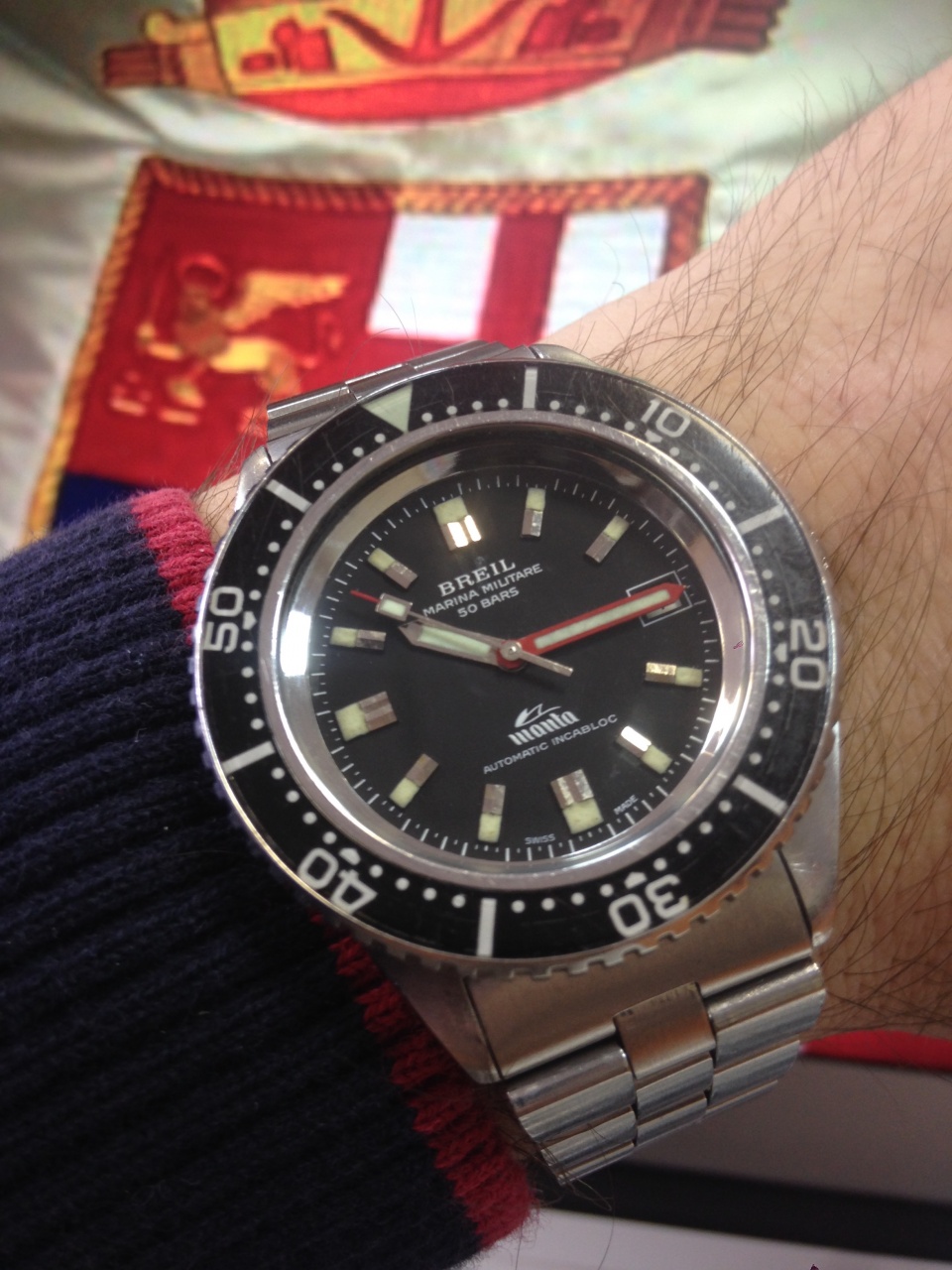 Breil Manta Marina Militare. Да-да, она самая Марина Милитаре. Настоящие часы итальянских боевых пловцов. Выбитый инвентарный номер на задней крышке. Тот же корпус, стрелки, безель, что и у Squale. Неудивительно, так как Squale была поставщиком. Я перекрасил стрелки в красный, вместо оригинального оранжевого. Эта процедура потеряла некоторую аутентичность, но добавила индивидуальности. Впрочем, родные стрелки я купил из старых запасов Squale. При необходимости можно все вернуть в оригинальное состояние.
